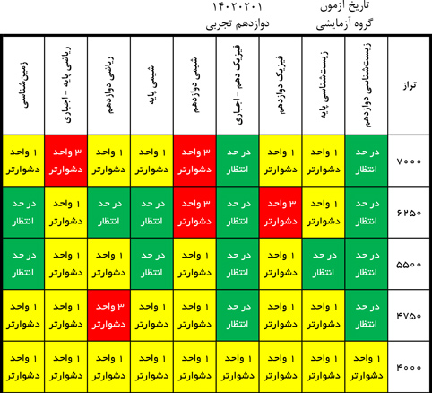 رنگ زرد (خانه هایی که با رنگ زرد مشخص شده اند): درس مورد نظر 1 یا 2 واحد دشوارتر از حد انتظار است.