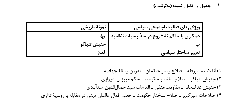 5 – بهترتيب درباره رويدادهاي (آغاز فعاليت رقابت آميز حضرت امام (ره)، شباهت انقلاب ايران با نهضتهاي آزاديبخش، مشكل عدالت خانه) كدام گزينه صحيح ميباشد؟