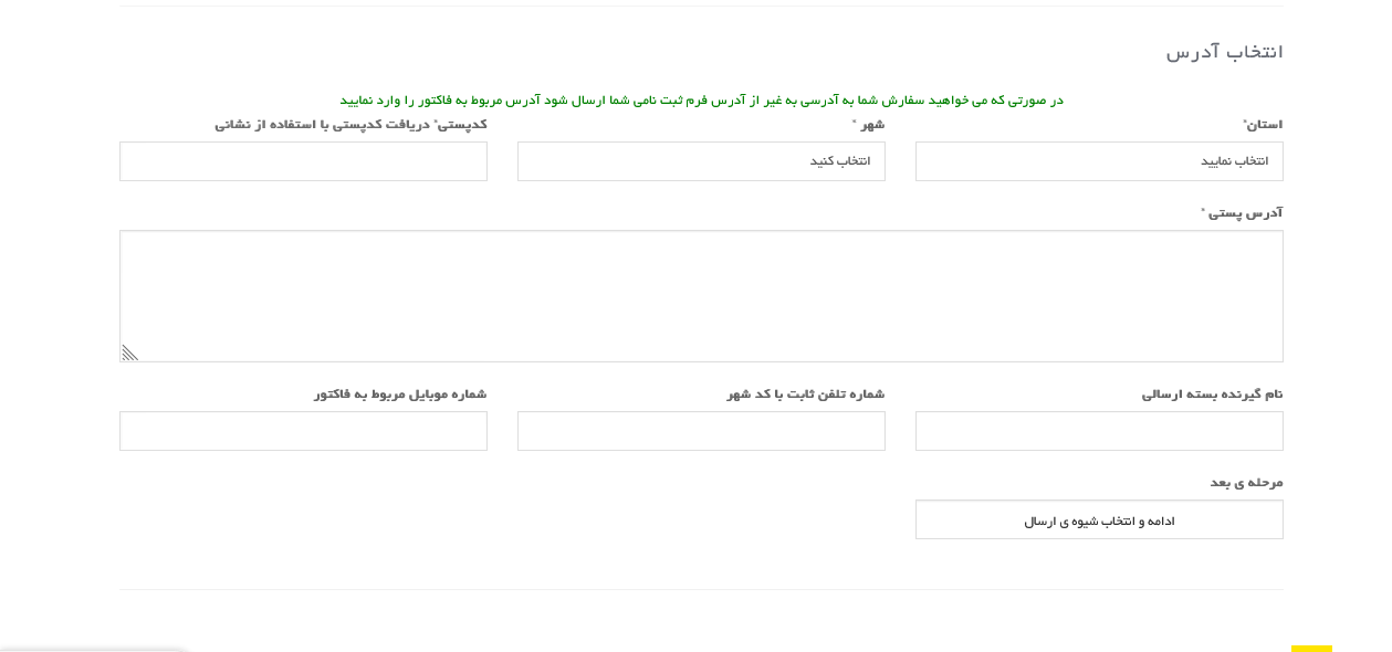 6- روی گزینه " تکمیل سفارش" کلیک کنید و اطلاعات آدرس شامل نام استان ،نام شهر ،کدپستی ، تلفن و نام سفارش دهنده را وارد کنید