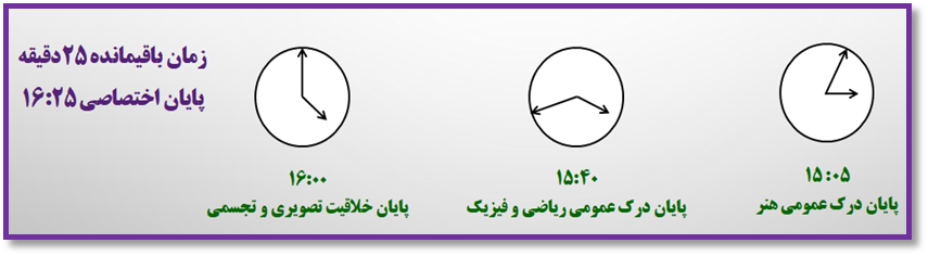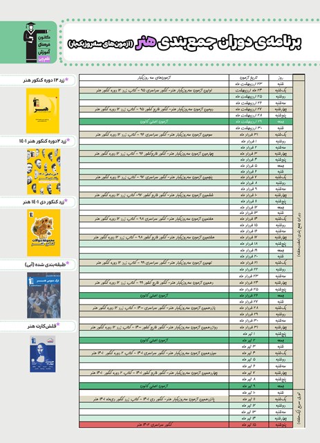 - * قابل توجه دوستان عزیز در رشتههای نظری که تصمیم دارند به جز کنکور رشته خود در کنکور هنر نیز شرکت کنند، شما عزیزان میتوانید از منابع و برنامه هنر در این ایام برای آشنایی بیشتر با کنکور هنر بهره ببرید. آزمونهای جامع هنر را بعدازظهر شرکت نمایید. (برای ثبتنام سه آزمون جامع هنر باید با نمایندگی خود هماهنگ شوید)