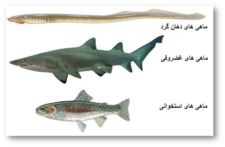 قزل آلا، ماهی قرمز، شیرماهی و ... از ماهی های استخوانی و کوسه ماهی،سفره ماهی، ماهی خاویار، اره ماهی و ... از ماهی های غضروفی هستند.