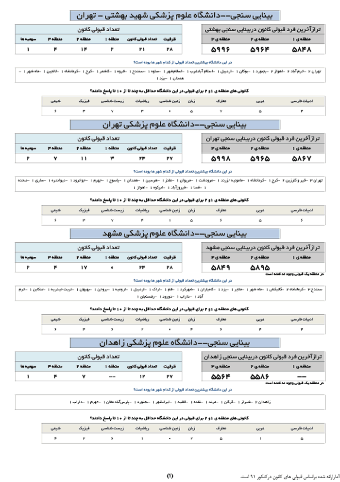 در جدول زیر تراز آخرین فرد قبول شده کانونی در رشته بینایی سنجی در دانشگاه های مختلف ارائه شده است.
