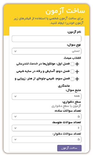 با آزمونساز هوشمند و شخصی میتوانید با توجه به سلیقه و نیاز خودتان به پشتوانه بانک قدرتمند پلکان با سه سطح دشواری، به تفکیک مبحث و زیر مبحث آزمونهای تستی و تشریحی بسازید.