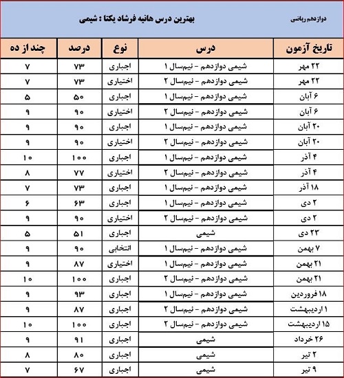 در درس شیمی خیلی بد بودم ، تفکیک کردم یعنی کاملا جداسازی کردم ، مسائل و فرمول ها جداگانه و مطالب حفطی وتیپ سوالات تستی را پیدا کردم و مطالعه کردم ، از 40 درصد به 70تا 100 درصد رسیدم (میانگین 80 درصد )
