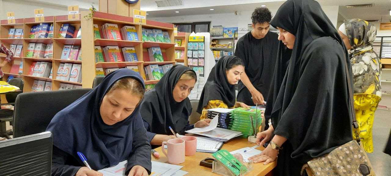 راهنمایی دانشآموزان بورسیه برای انتخاب کتاب که همراه مادر خود برای دریافت کتابهای اهدایی آمدند