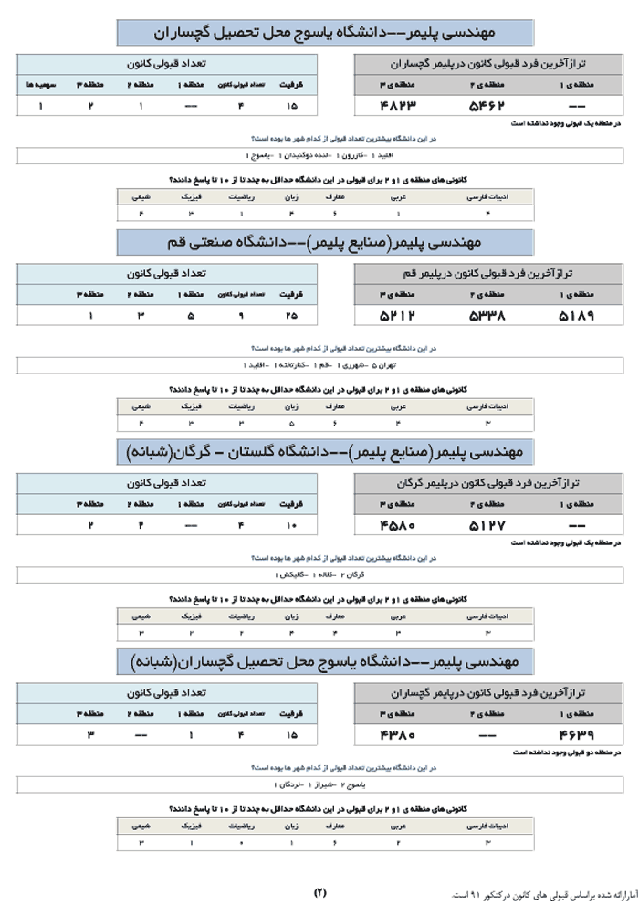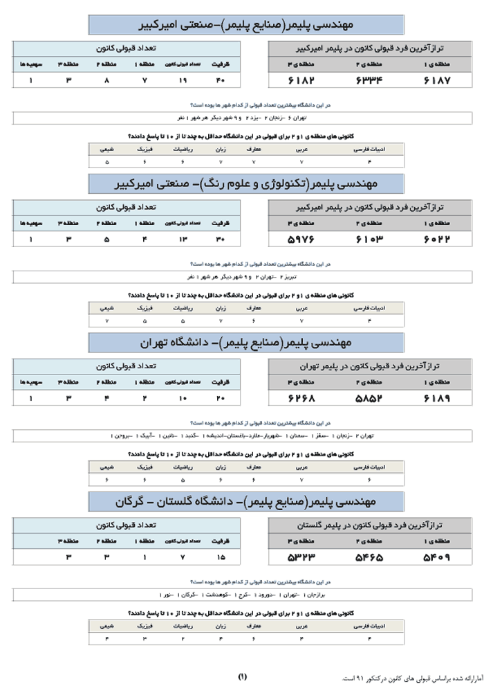در جدول زیر تراز آخرین فرد قبول شده کانونی در رشته مهندسی پلیمردر دانشگاه های مختلف ارائه شده است.