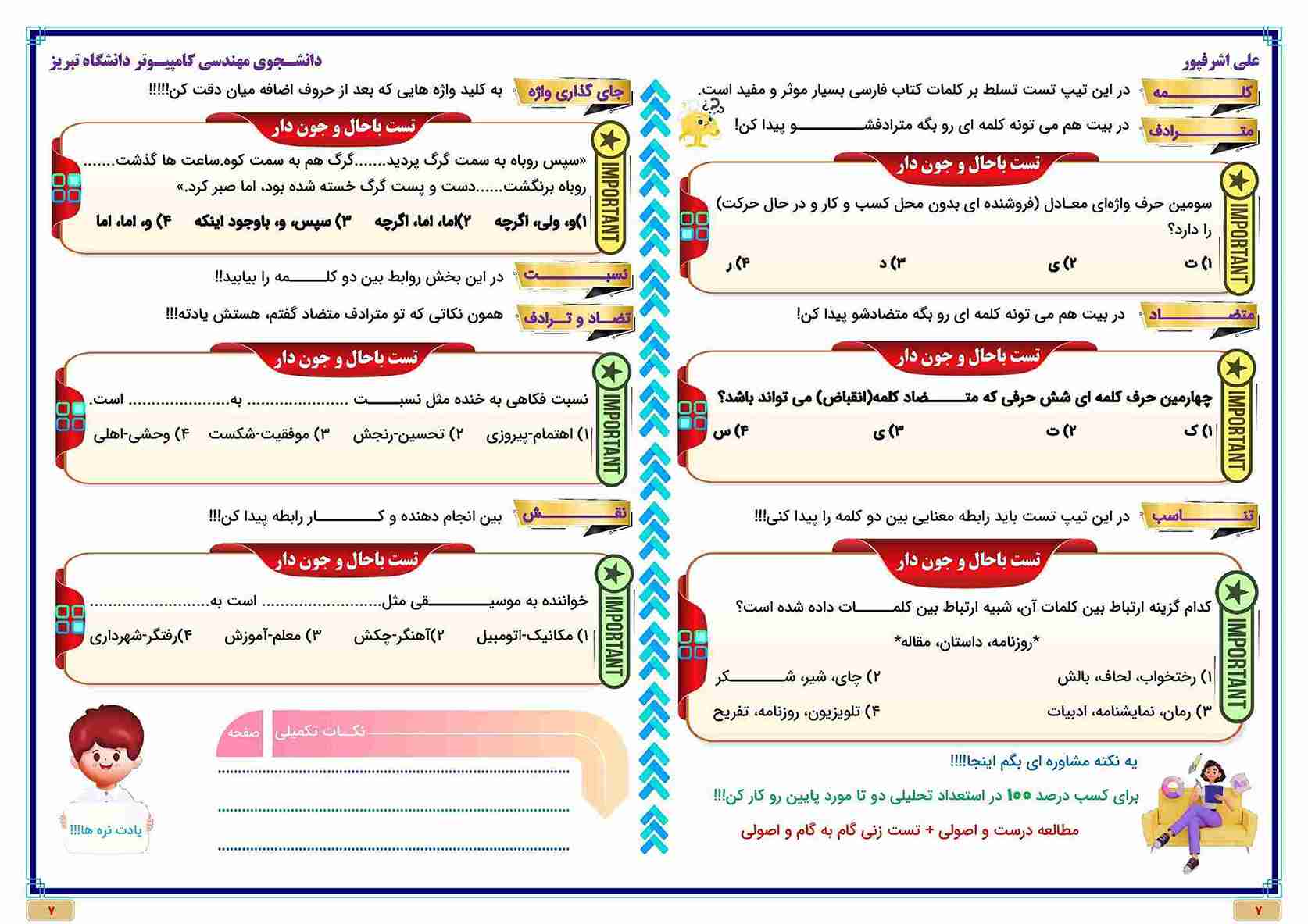 این صفحه توسط خودت پر میشه و تمام نکات مهمی که در هوش کلامی یاد گرفتی باید اینجا قشنگ و مرتب بنویسی و زمانی که میخوای جمع بندی کنی برای آزمون بخونی قط کافیه این صفحه رو یه دور مرور کنی چون همه نکات مهمی که تو نیاز داری رو داره:)))