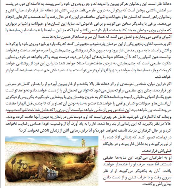 شخص با حقیقت روبه رو شده وقتی به درون غار بر می گردد اطرافیانش حرف های اورا به سخره می گیرند.