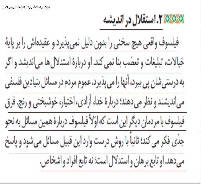 نکات مهم:ویژگی های فیلسوف واقعی1-هیچ سخنی را بدون دلیل نمی پذیرد2-عقیده اش را بر پایه تبلیغات و تعصبات بنا نمی کند3-او درباره استدلال ها می اندیشد و اگر به درستی انها پی ببرد آنها را می پذیرد.