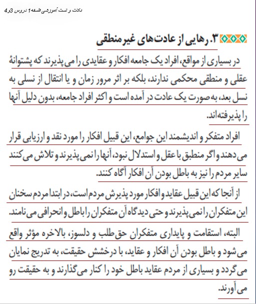 نکات مهم: افراد متفکر جامعه افکاری که از دیرباز به صورت یک عادت مقبول افراد جامعه بوده را ارزیابی می کنند و بعد اگر موردی داشت آنرا را رد می کنند اما به این اکتفا نکرده و تلاش می کنند که دیگران هم راجب غلط بودن آن افکار آگاه سازند.