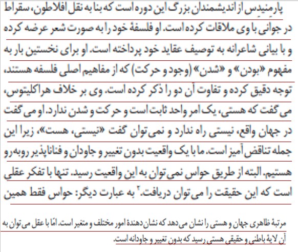 پارمنیدس اعتقاد داشت با عقل می توان به لایه باطنی و حقیقی هستی رسید که بدون تغییر و جاودانه است.