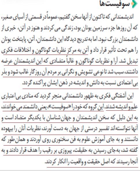سوفیست در آن زمان به معنای دانشمند بود که بعدها معنای مغالطه کار گرفت.