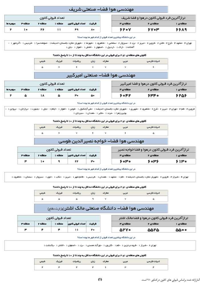 در جدول زیر تراز آخرین فرد قبول شده کانونی در رشته مهندسی هوا و فضادر دانشگاه های مختلف ارائه شده است.
