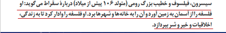 نکات: منظور سیسرون این است که سقراط مسیر فلسفه را تغییر داد آن را وادار کرد که به زندگی و اخلاقیات و خیر و شر بپردازد.