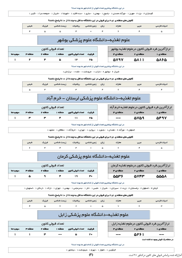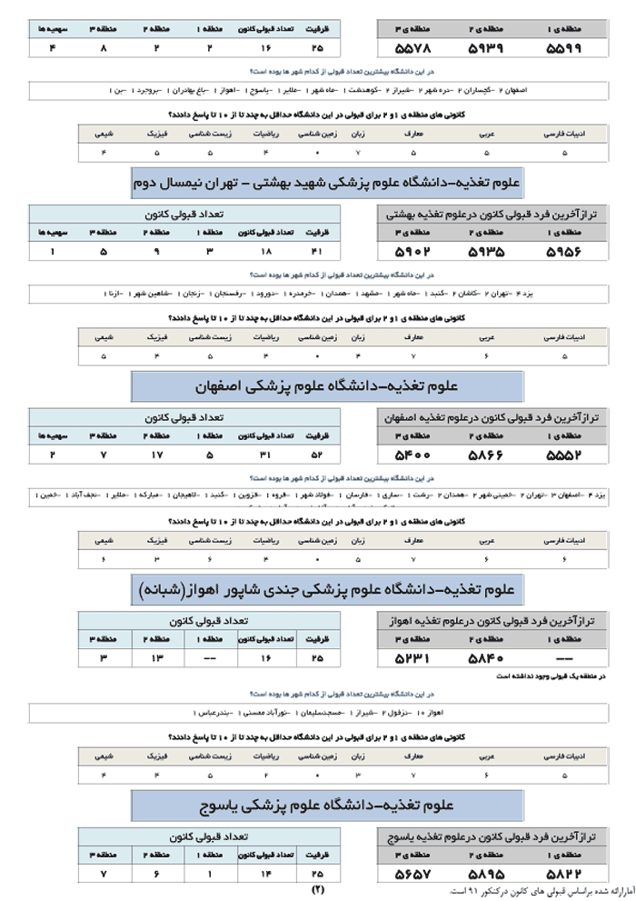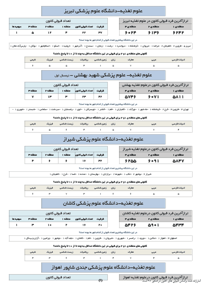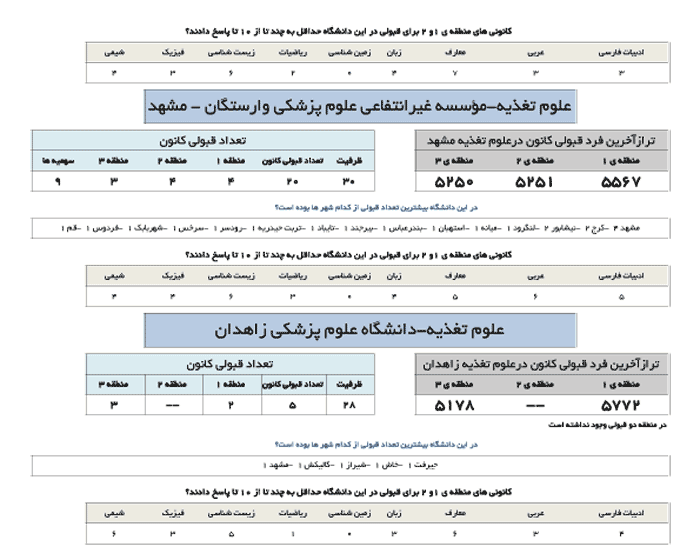 در جدول زیر تراز آخرین فرد قبول شده کانونی در رشته علوم تغذیه در دانشگاه های مختلف ارائه شده است.