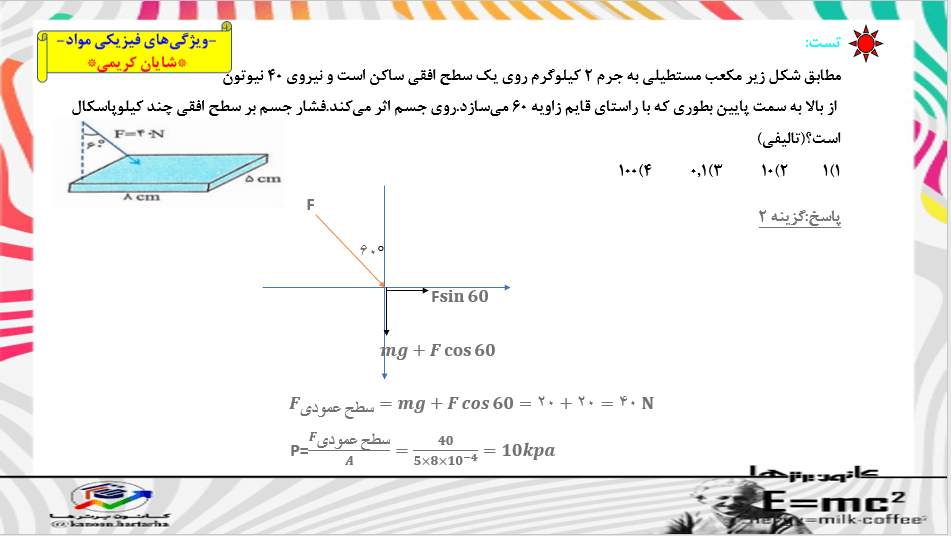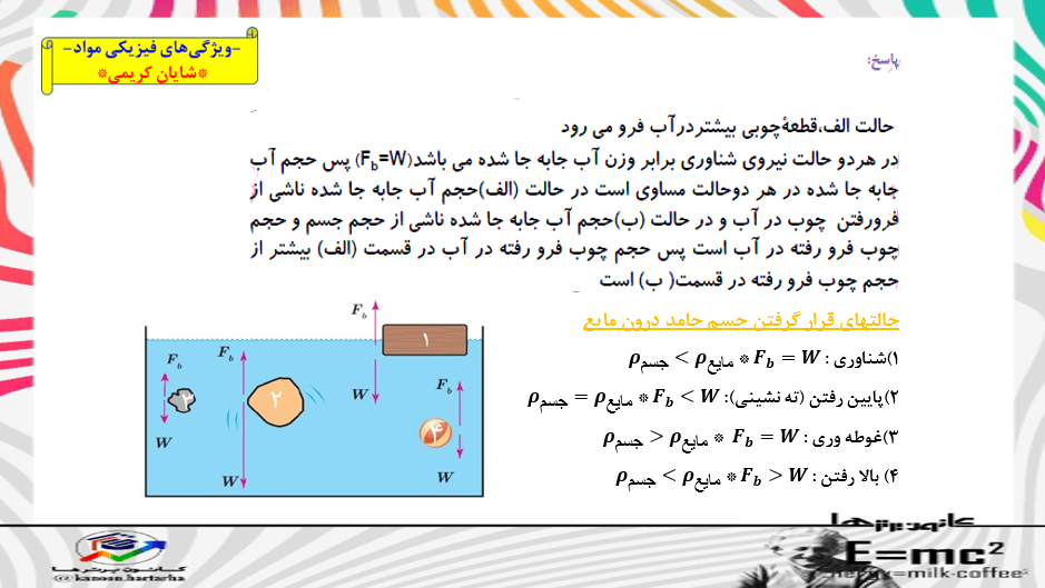 💥نکته:مولکول ها در اثر حرارت منبسط میشوند و اندازه مولکول آنها درشتتر میشود و در نتیجه فاصلشون زیاد میشود که این خود باعث کاهش نیروی همچسبی است. پس با افزایش دما نیروی همچسبی کاهش می یابد.