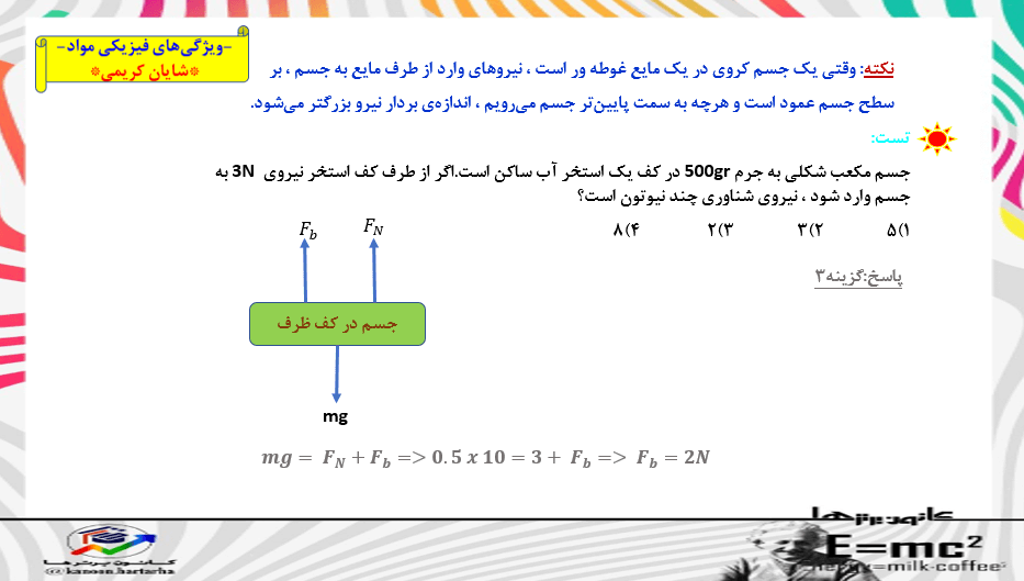 💥نکته: 1 .افزایش دمای آب و ۲ .افزودن شوینده به آب سبب کاهش کشش سطحی آب می شود. در اثر کاهش کشش سطحی، آب راحتتر شکافته می شود و قدرت نفوذ آن در منافذ لباس بیشتر می شود و اثرپاک کنندگی آب افزایش می یابد.