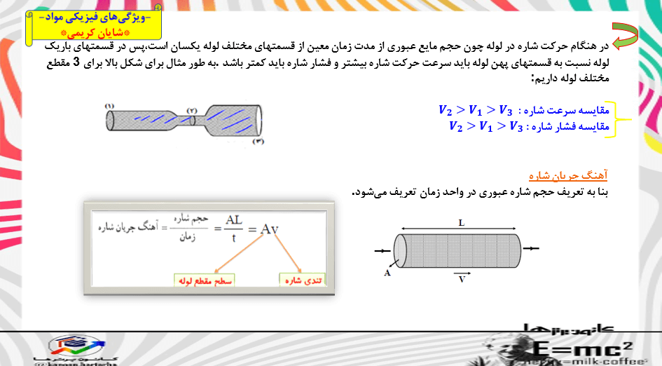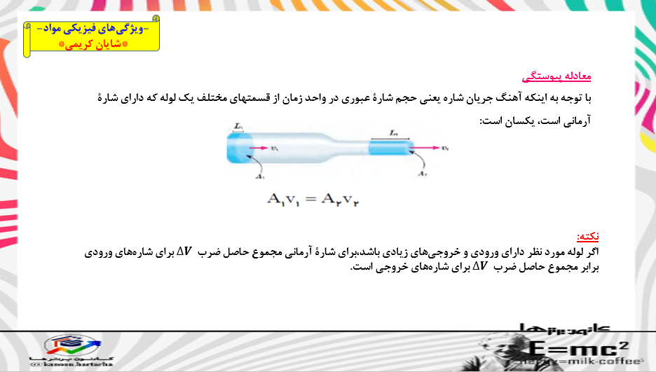💥نکته:در حالت پایا که همه جای لوله پر از آب است، مقدار آبی که در یک مدت زمان معین از یک مقطع لوله میگذرد، با مقدار آبی که از هر مقطع دیگر لوله میگذرد، یکسان است.