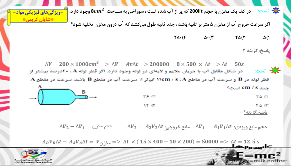 1. اگر مایعی که از درون دو قطره چکان که در شکل روبه رو میبینید ، میچکد از یک نوع و با دماهای متفاوت باشند با توجه به نکتههای که گفتیم میتوان گفت دمای مایعی که قطرههای آن کوچکتر است ،بیشتر است چون کشش سطحی آن کمتر است.