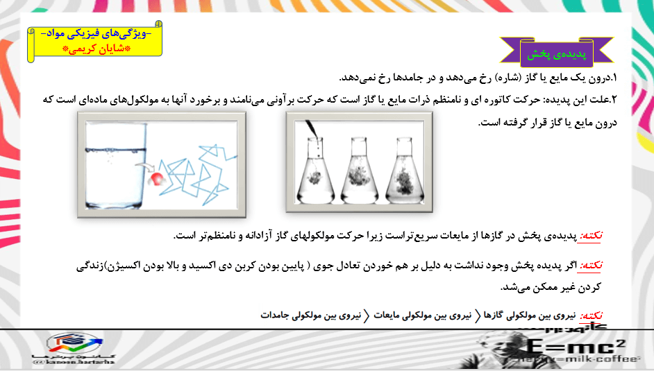 💥نکته: در اثر گرم کردن قطعات شیشه شکسته ، قطعات به هم می چسبند. زیرا در اثر افزایش دما ، فاصلهی مولکولها کم شده و نیروهای همچسبی زیاد شده و سبب چسبیده شدن قطعات می شود.