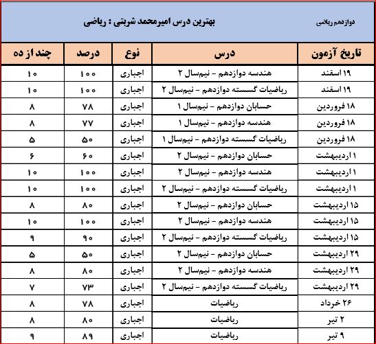 بنده در طول سال همواره سعی کردم تعادل میان دروس را حفظ کنم و همگی را در سطح بالا قرار دهم ریاضی بهترین درس بنده بود ولی چون در کنکور فیزیک از دو درس دیگر راحت تر بود، این درس را بهتر از دو درس دیگر زدم ،البته اکثر دانش آموزان و دوستان بنده که می دانم فیزیک را بهتر زدند.