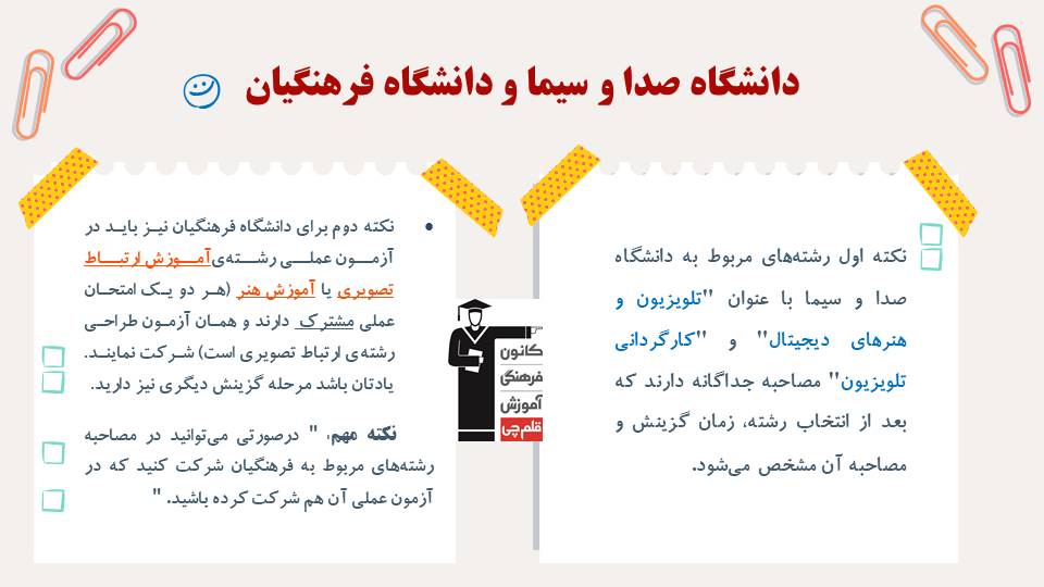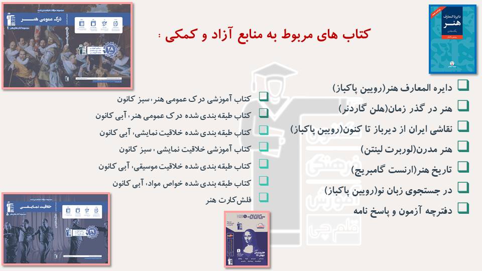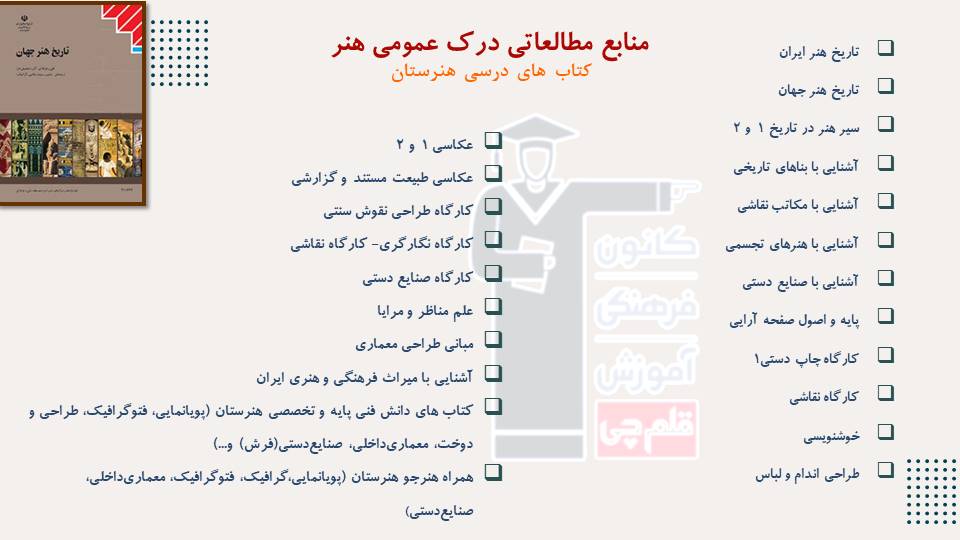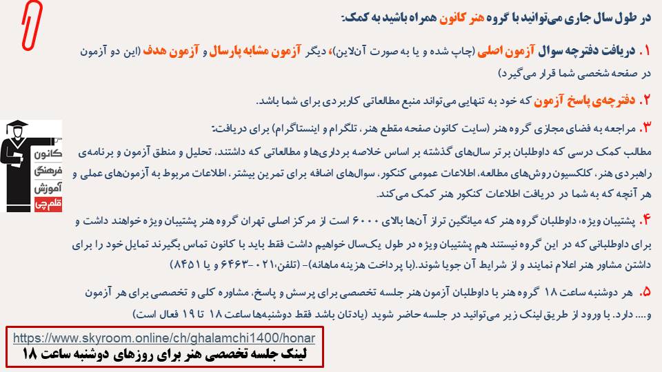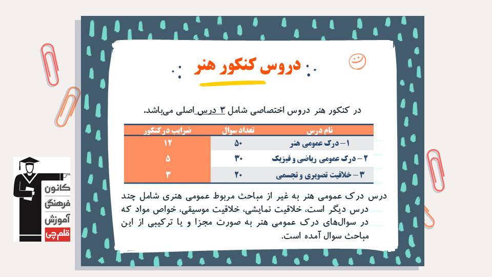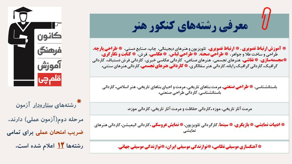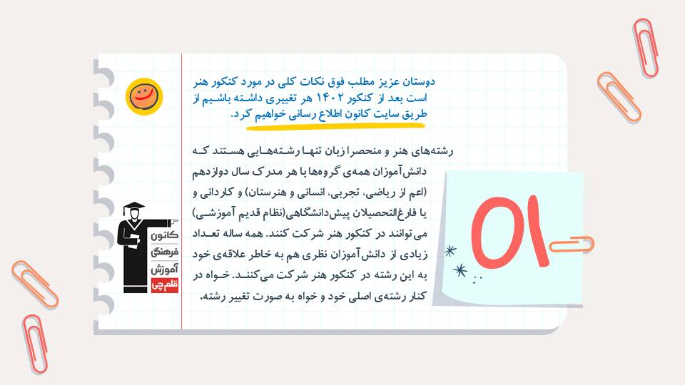 سلام وقت بخیر. دوستان عزیز مطلب فوق به شما کمک میکند تا نکتههای اصلی و مواردی که باید برای کنکور هنر بررسی کنید در زیر آورده شده است.