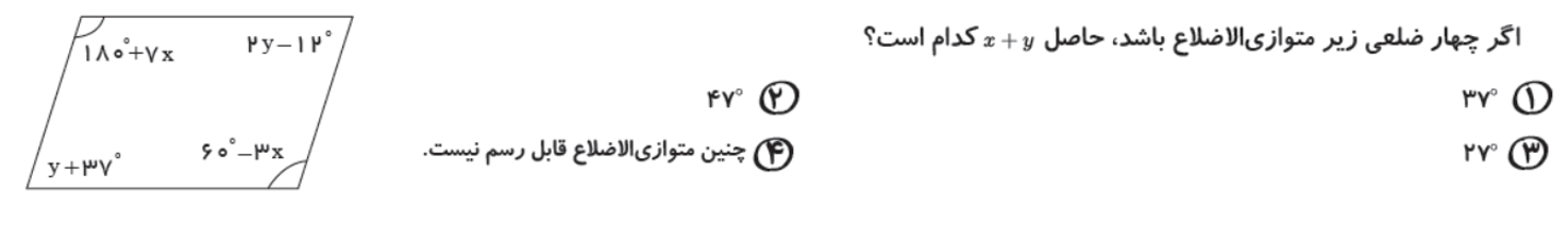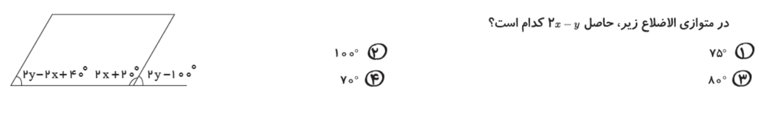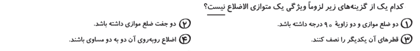 خواص متوازی الاضلاع : 1) اضالاع روبه رو موازی و مساویند 2) زاویه های روبه رو مساویند