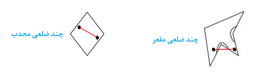 نکته : اگر در یک چند ضلعی دو نقطه دلخواه انتخاب کنیم و آن دو نقطه را بایک خط راست به هم وصل کنیم اگر قسمتی از خط بیرون از چند ضلعی قرار گرفت آن چندضلعی مقعر است،اگر تمام خط داخل چند ضلعی قرار گرفت چند ضلعی محدب است.