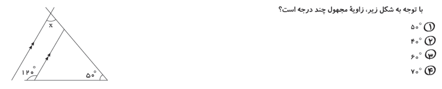 نکته : در هر مثلث اندازه ی زاویه خارجی برابر است با مجموع دو زاویه داخلی غیر مجاور آن.