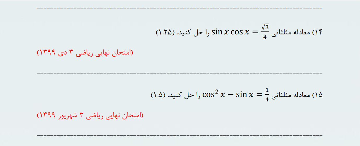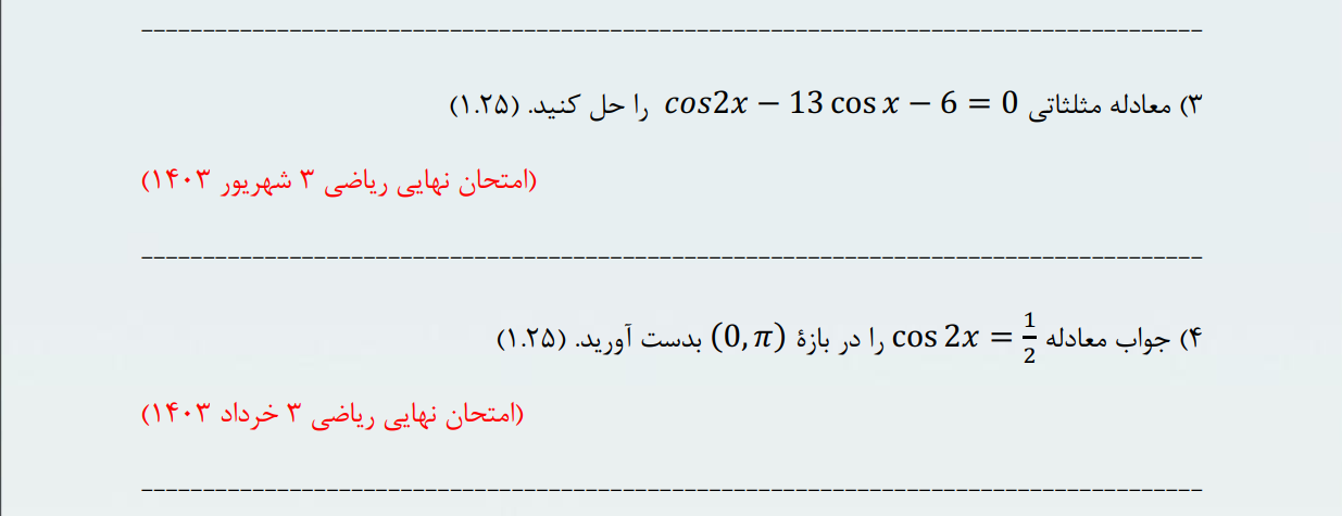 دانش آموزان گرامی در این مطلب سوالات امتحانات نهایی ادوار گذشته درس ریاضی 3 تجربی بصورت تفکیک شده (فصل به فصل) قرار داده شده.