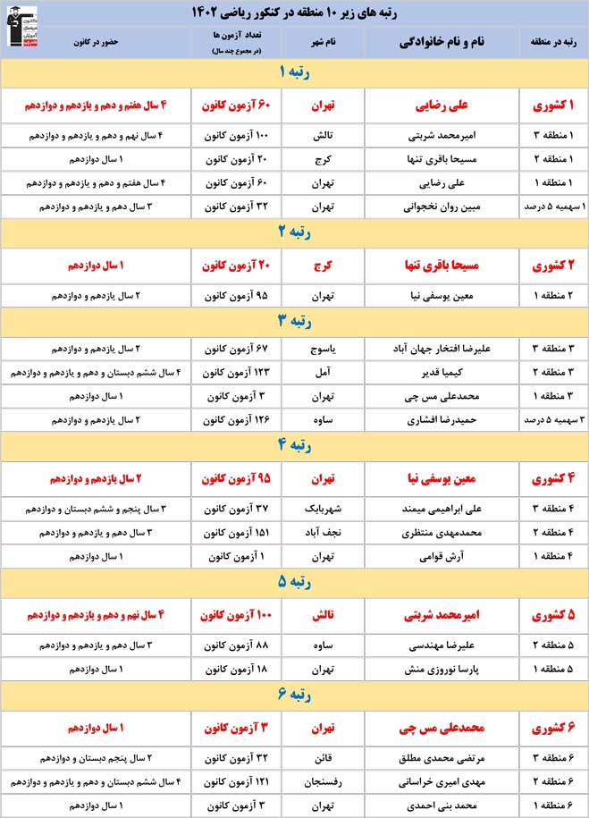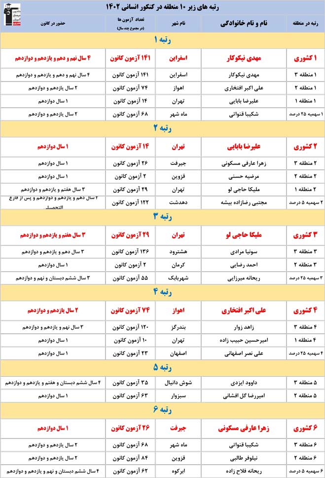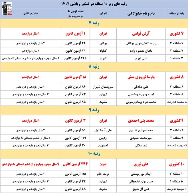 اسامی رتبه های زیر ۱۰ کانون در کنکور 1402 در مناطق مختلف را در ادامه مشاهده کنید .