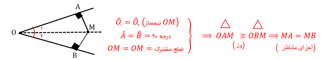 نکته : هر نقطه روی نیمساز زاویه از دو ضلع زاویه به یک فاصله است.