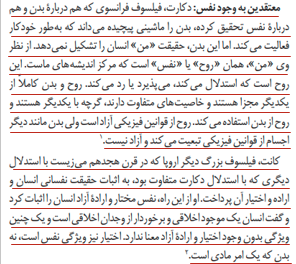 نکات: دکارت جزو آن دسته از افراد است که روح یا نفس را قبول دارد به اعتقاد وی روح از بدن مجزاست اما باهم هستند بدن همچون سایر اجسام از قوانین فیزیکی تبعیت می کند اما روح اینطور نیست.