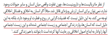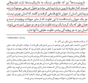 نکات: داروینیست ها از نظریه داروین استفاده کردند و به این نتیجه رسیدند که انسان چیزی جز یک حیوان راست قامت نیست و مانند سایر موجودات یک حیوان است تنها تفاوتش پیچیده تر بودن آن است.