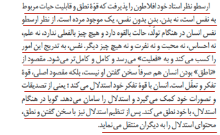 نکات: ارسطو پذیرفت که قوه نطق و قابلیت حیات مربوط به نفس است و منظور وی از نطق صرفا سخن گفتن نبود بلکه منظور اصلی وی قابلیت تفکر و تعقل بود.