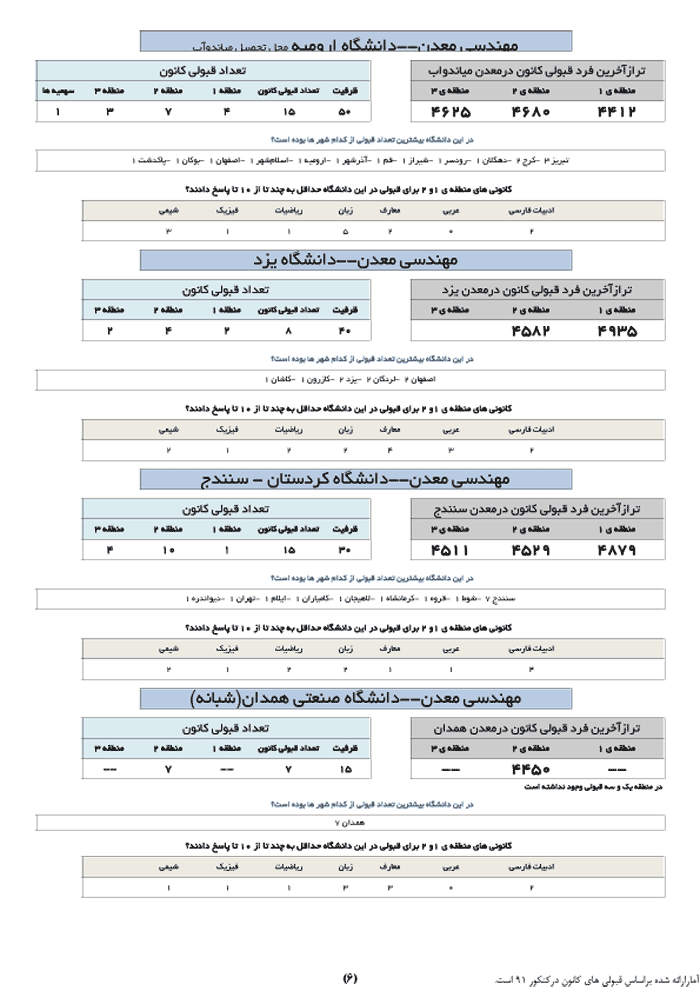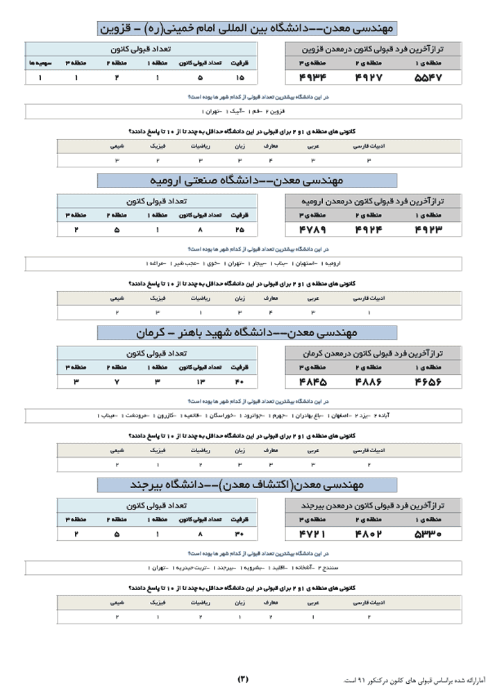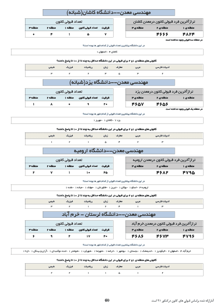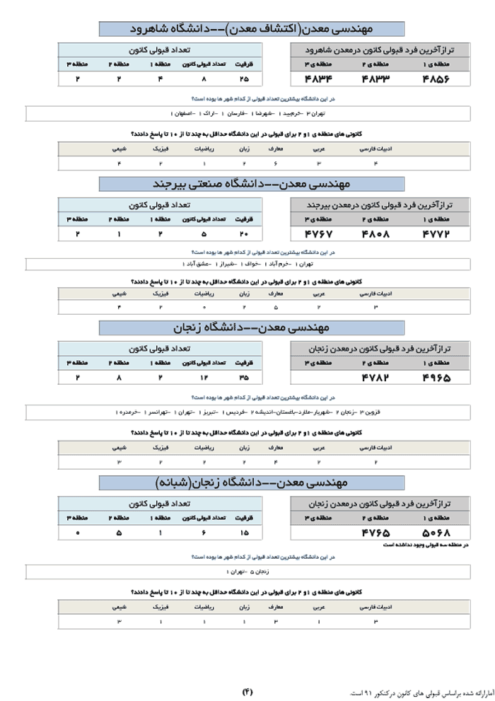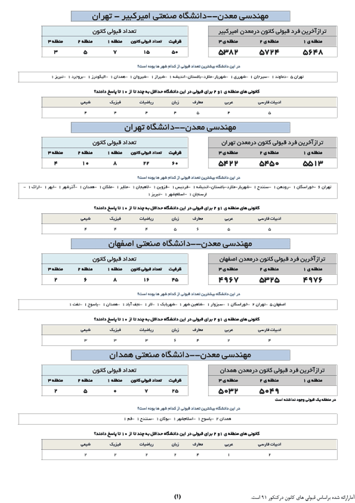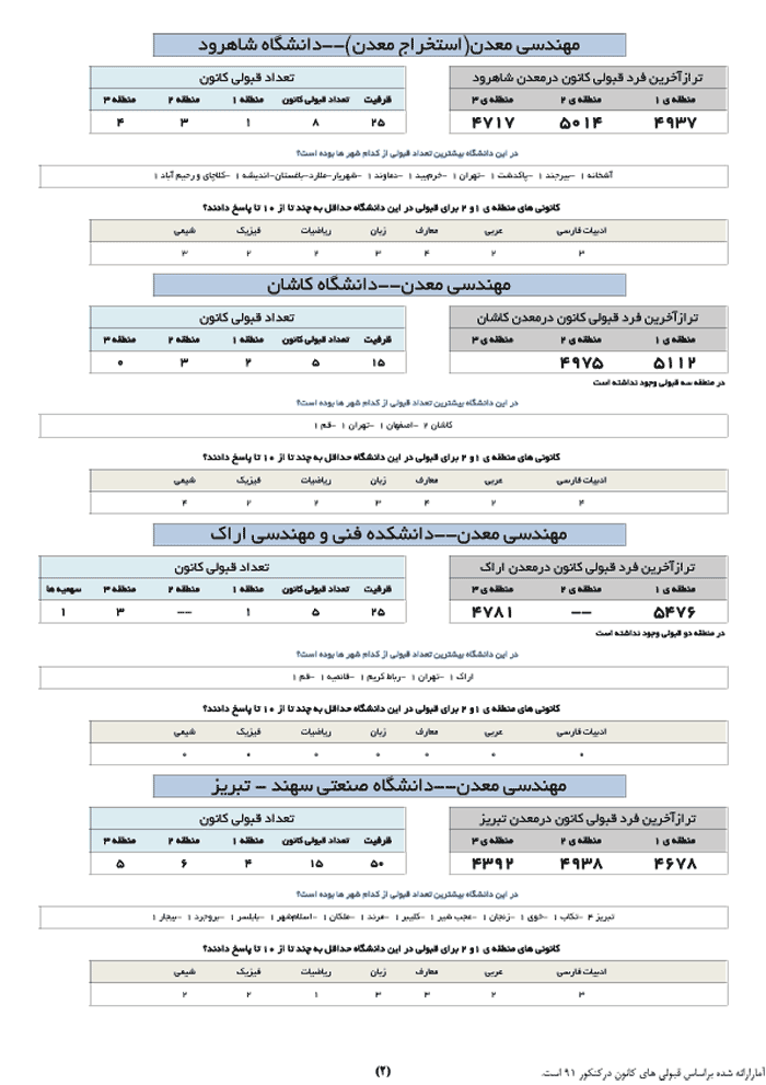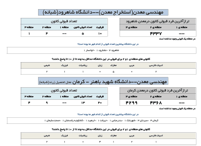 در جدول زیر تراز آخرین فرد قبول شده کانونی در رشته مهندسی معدن در دانشگاه های مختلف ارائه شده است.