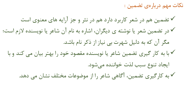 تضمین در اصطالح ادبی : وقتی عین آیه، حدیث، مصراع، بیت، اصل نوشته یا سخن دیگری را بر قصد تمثیل و عاریت در شعر یا نثر بیاورند، تضمین ایجاد کردهاند
