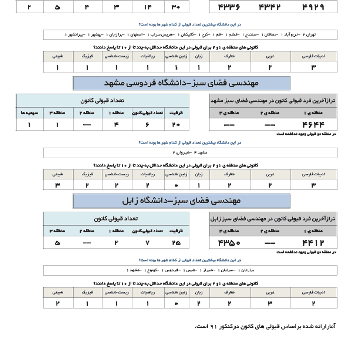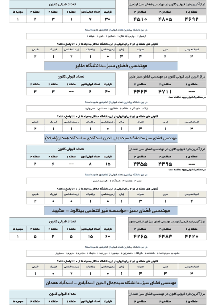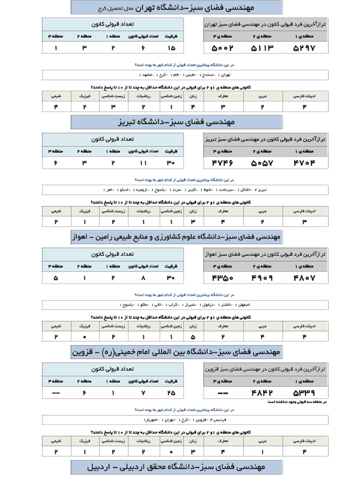 در جدول زیر تراز آخرین فرد قبول شده کانونی در رشته مهندسی فضای سبز در دانشگاه های مختلف ارائه شده است.