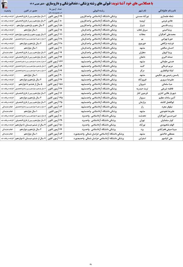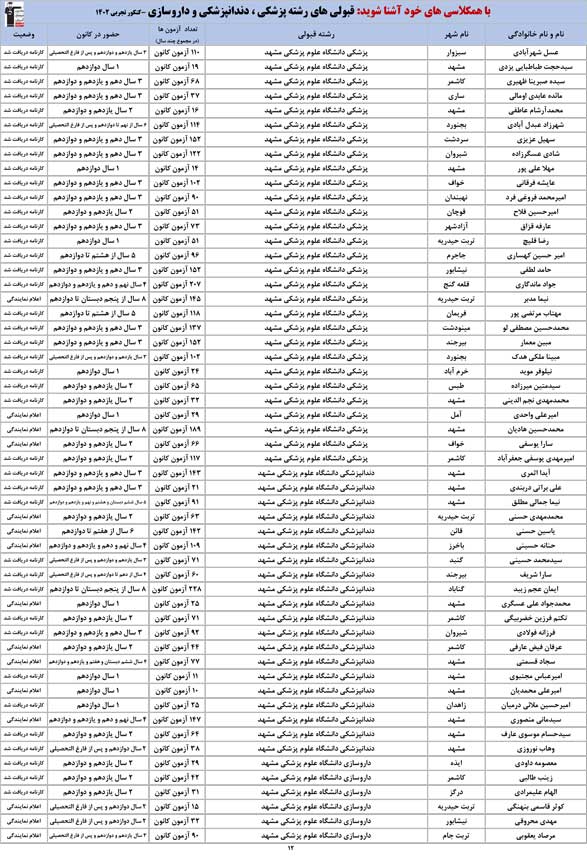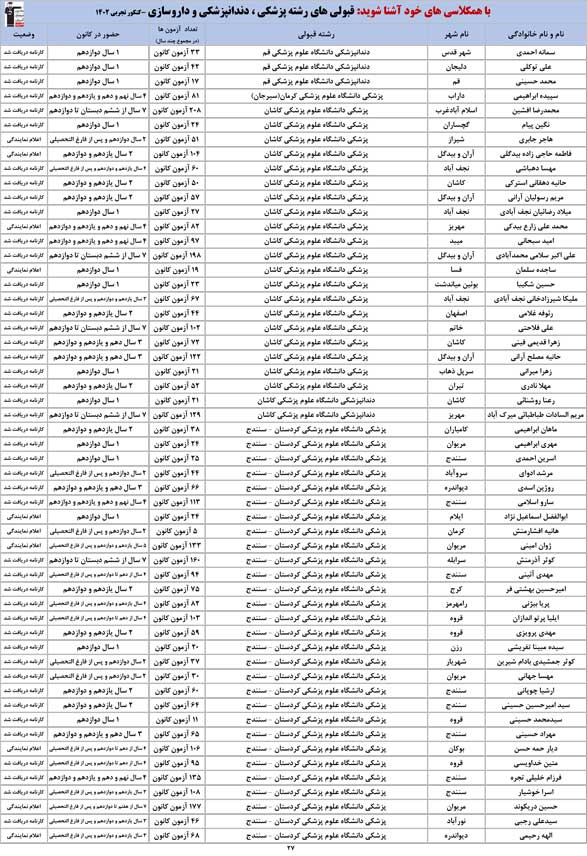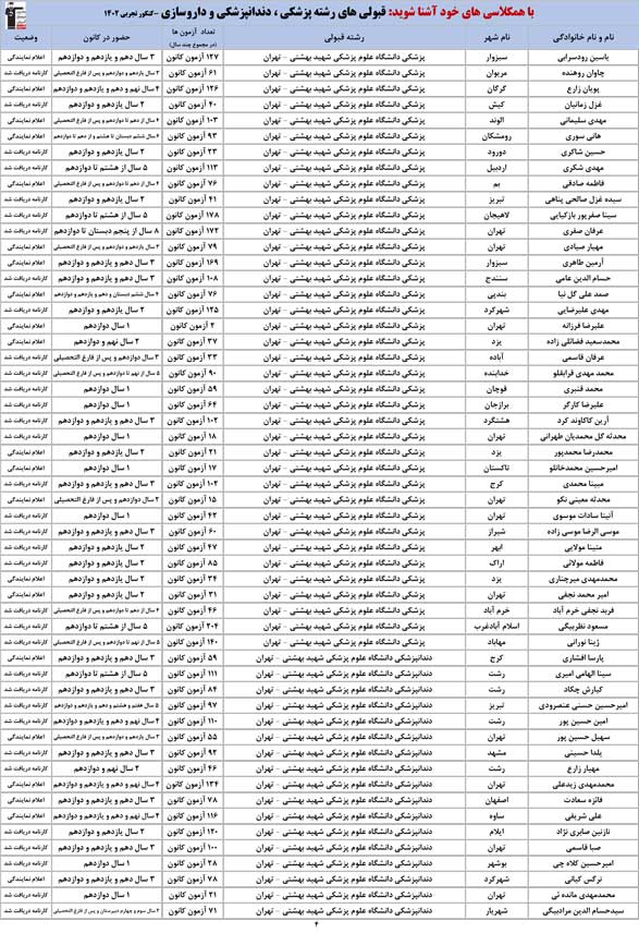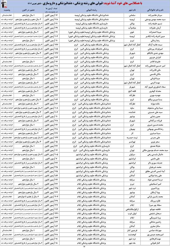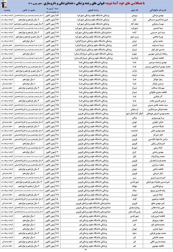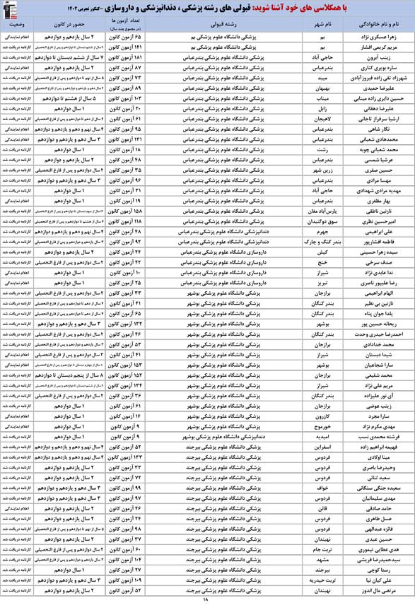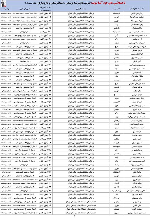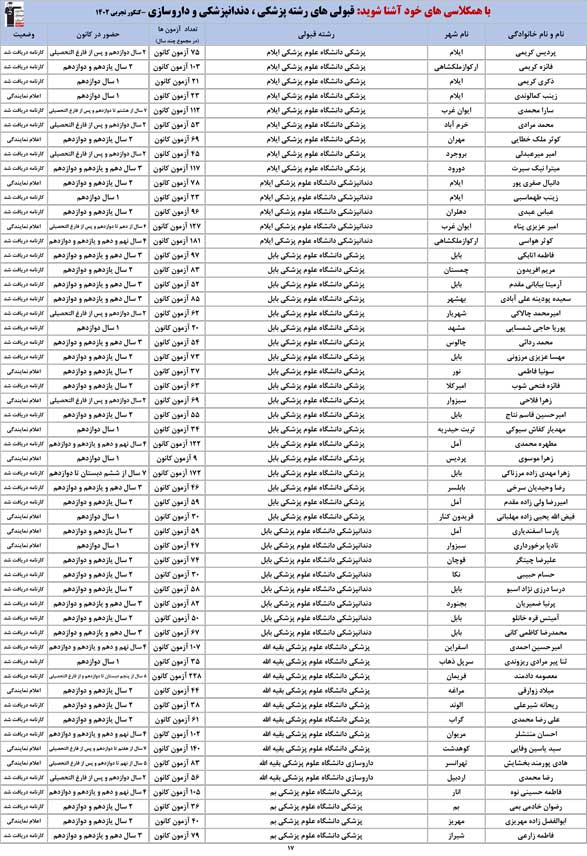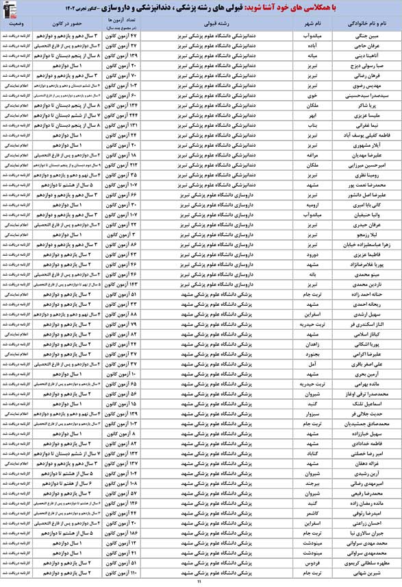 این لیست ابتدا به ترتیب نام دانشگاه و رشته قبولی و سپس حروف الفبای نام خانوادگی مرتب شده است.