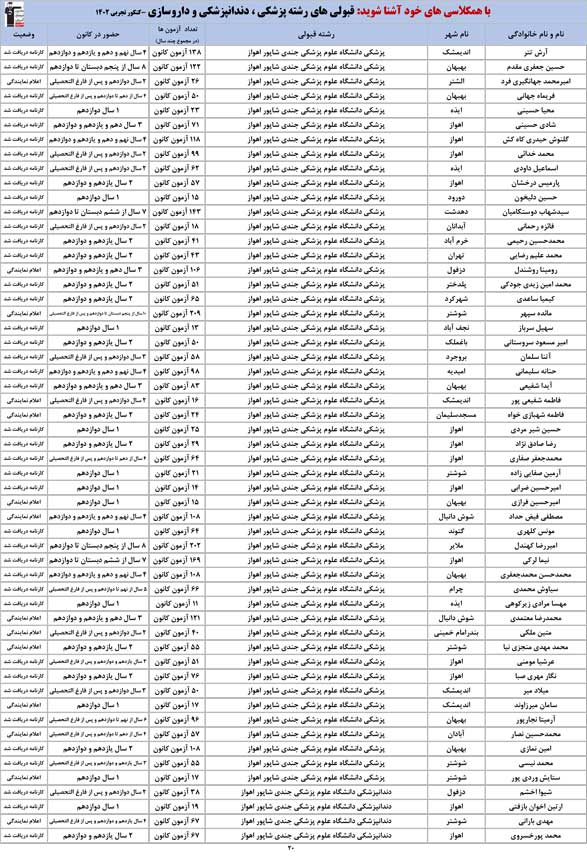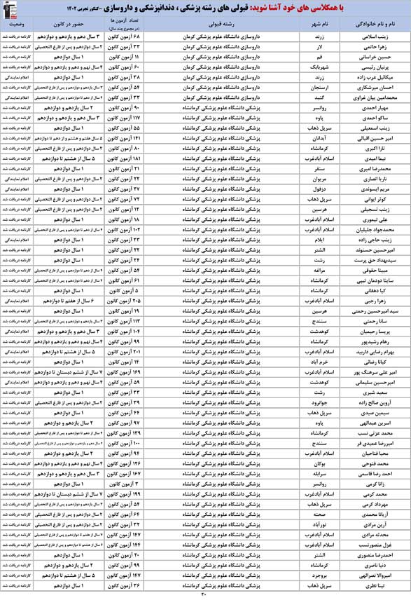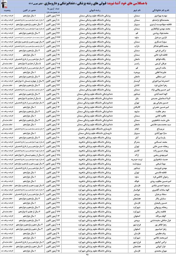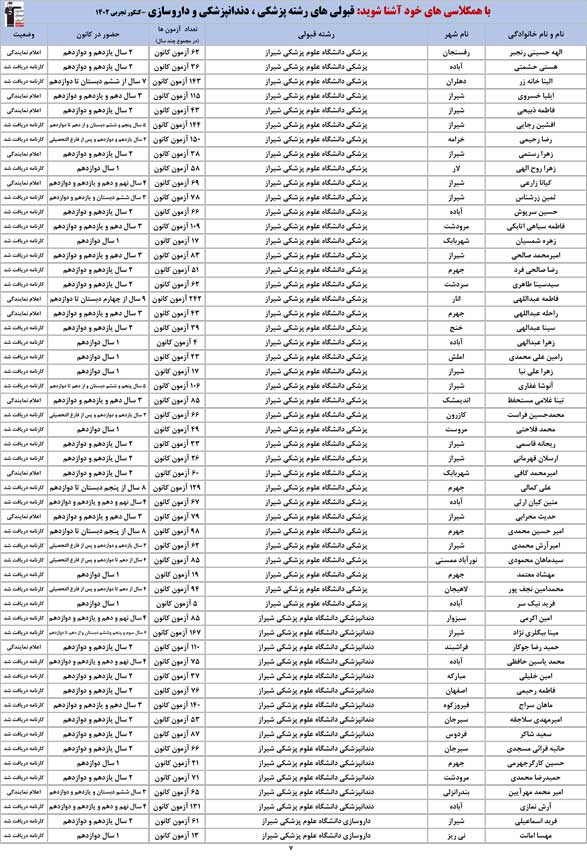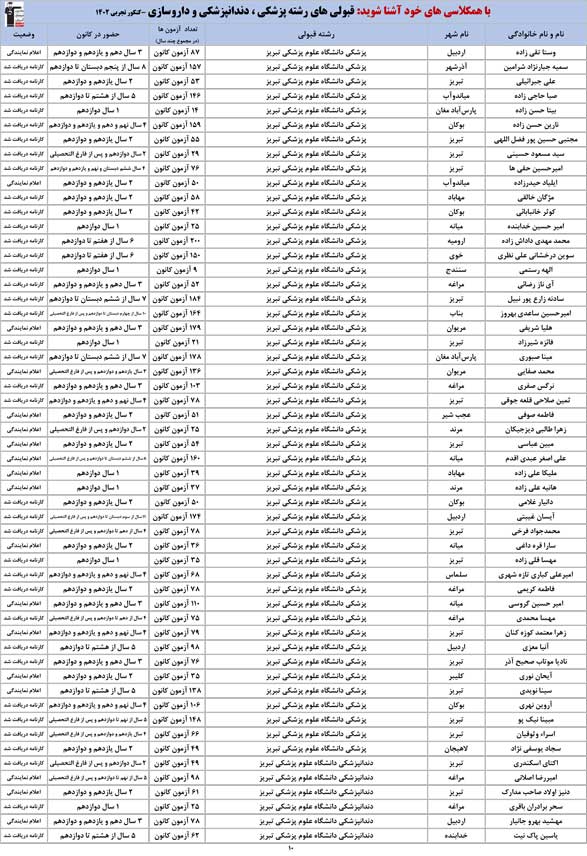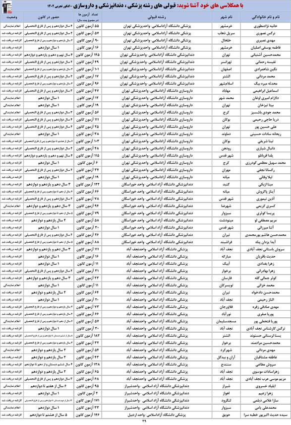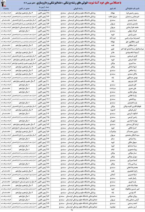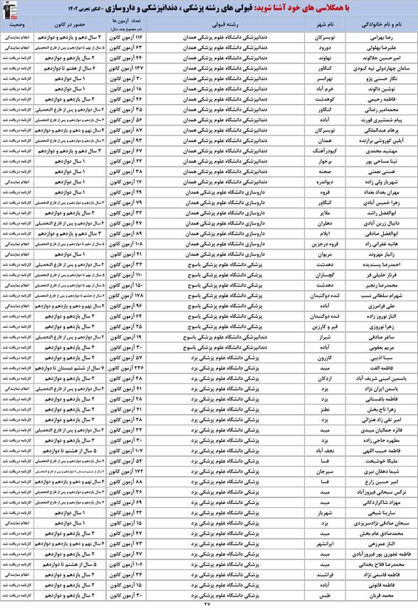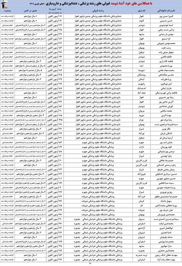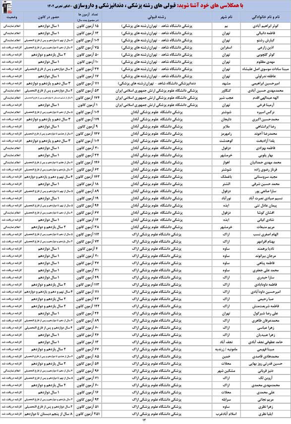 این لیست ابتدا به ترتیب نام دانشگاه و رشته قبولی و سپس حروف الفبای نام خانوادگی مرتب شده است.
