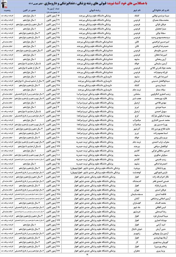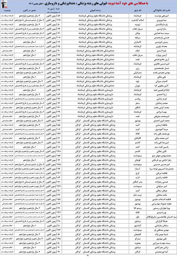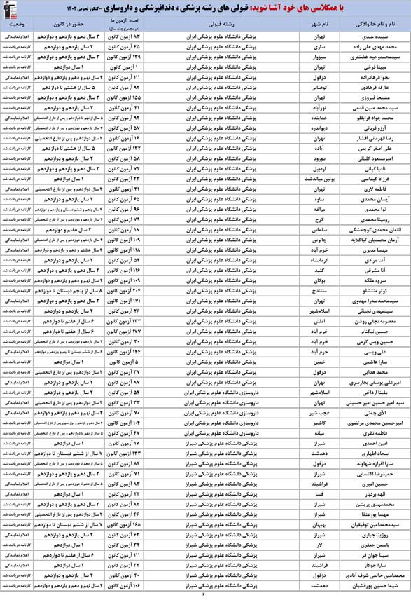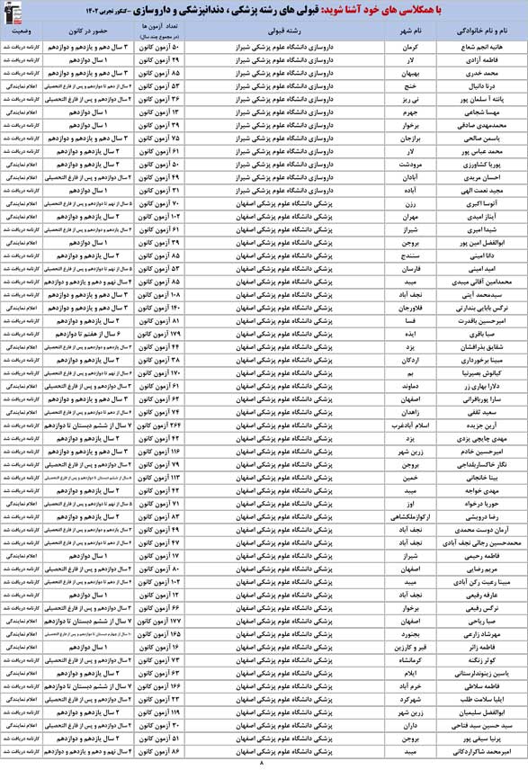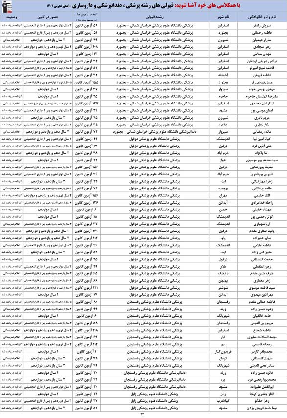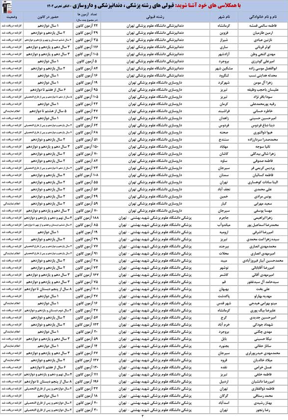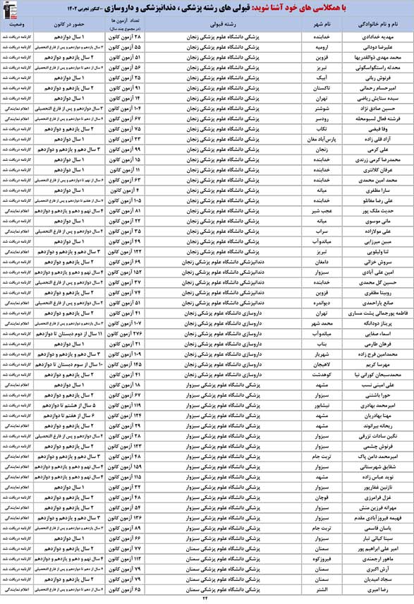 جدید: قبولیهای پزشکی،دندان ودارو 1402 (خوداظهاری تا 19 مهر)