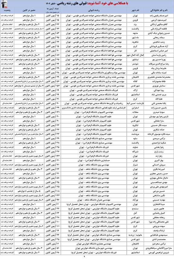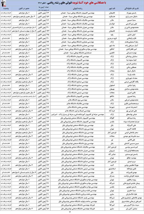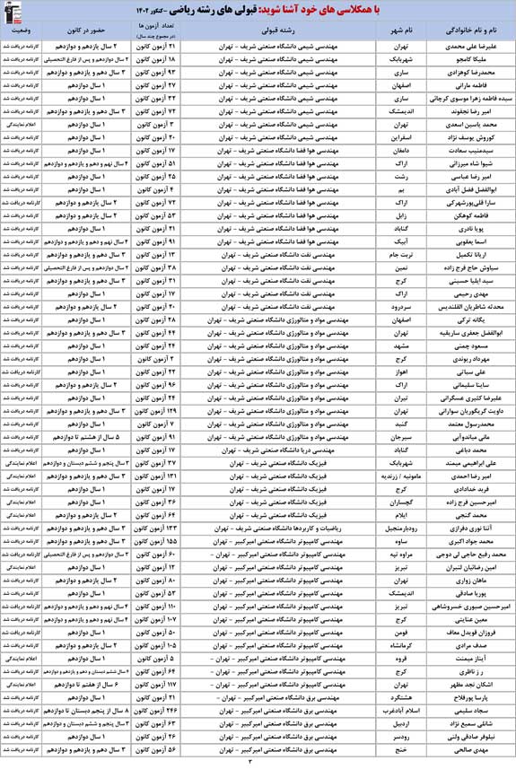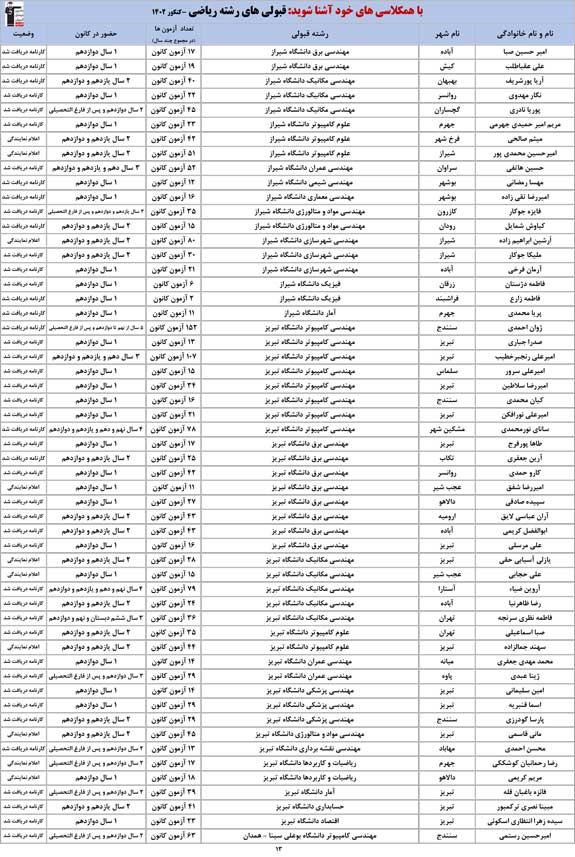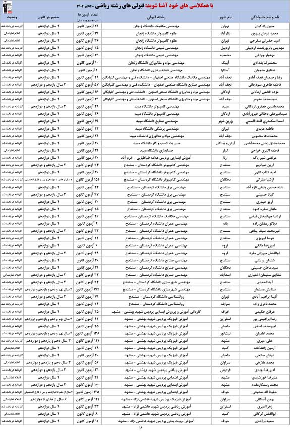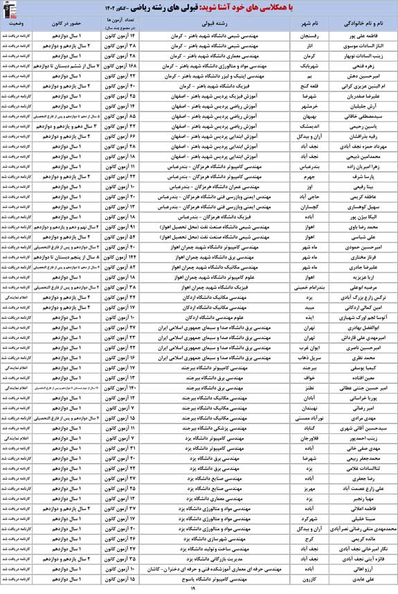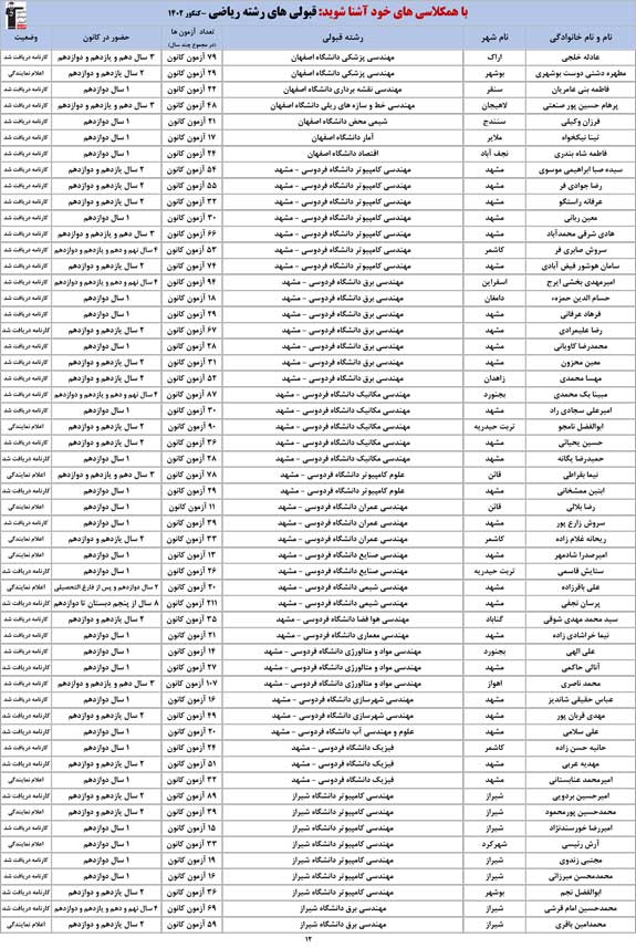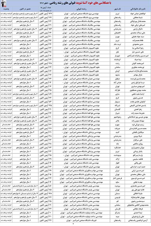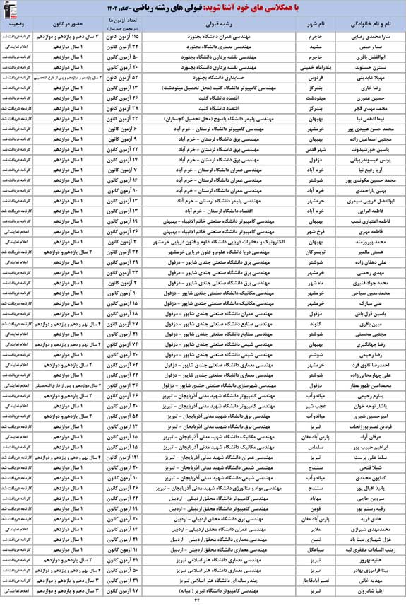 این لیست ابتدا به ترتیب نام دانشگاه و رشته قبولی و سپس حروف الفبای نام خانوادگی مرتب شده است.
