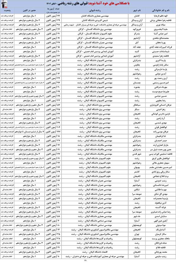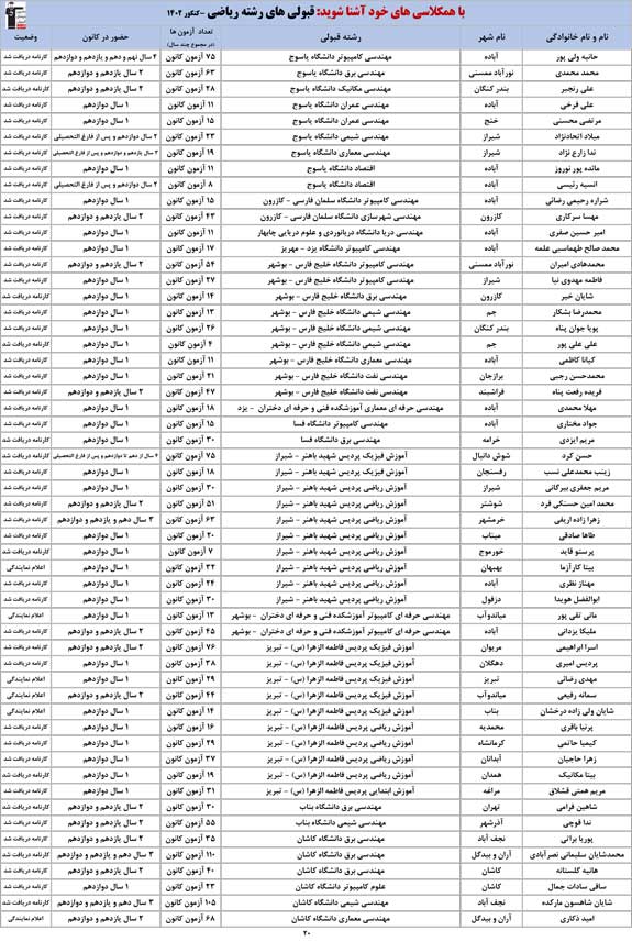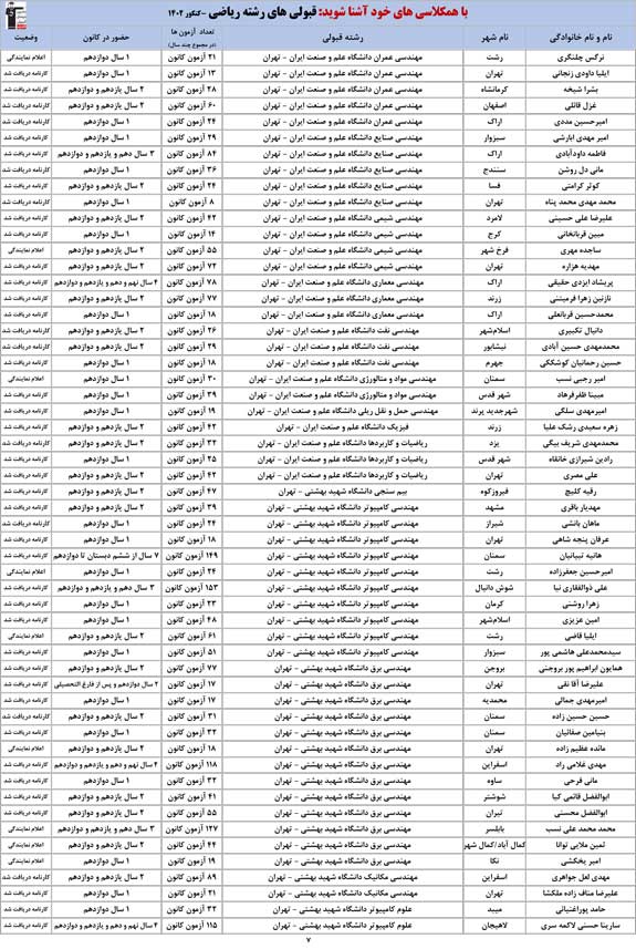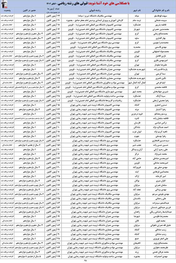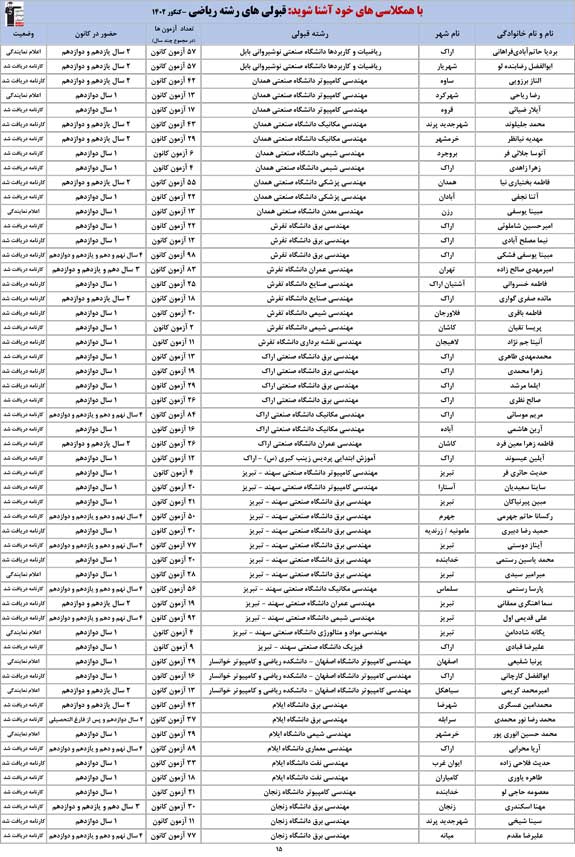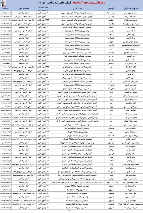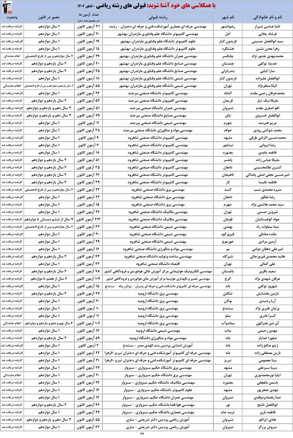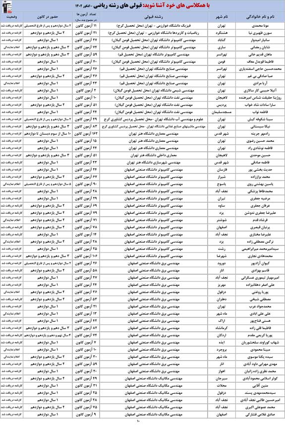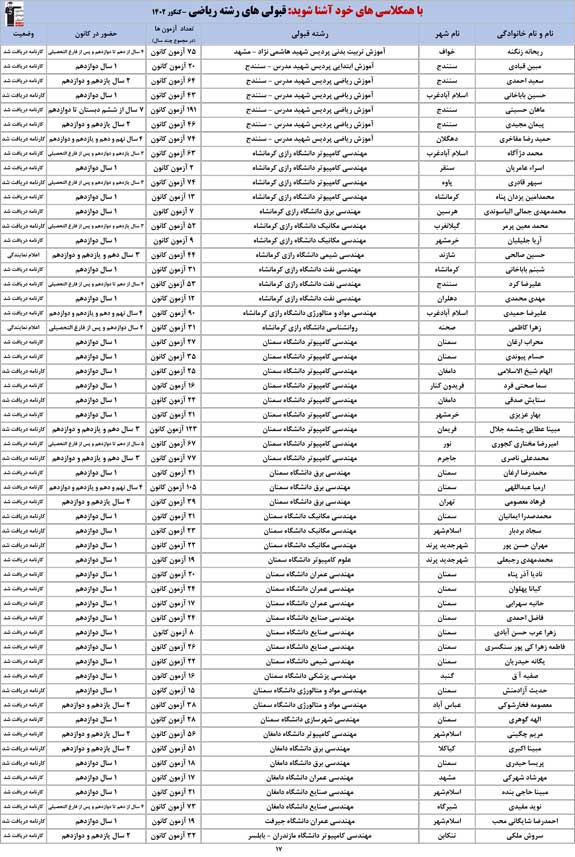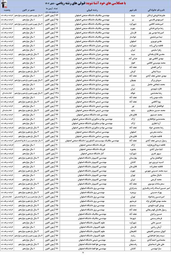 این لیست ابتدا به ترتیب نام دانشگاه و رشته قبولی و سپس حروف الفبای نام خانوادگی مرتب شده است.