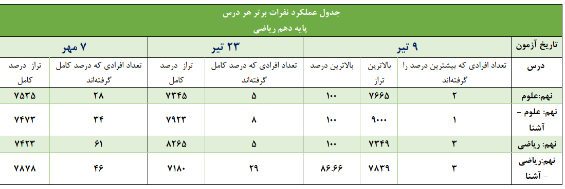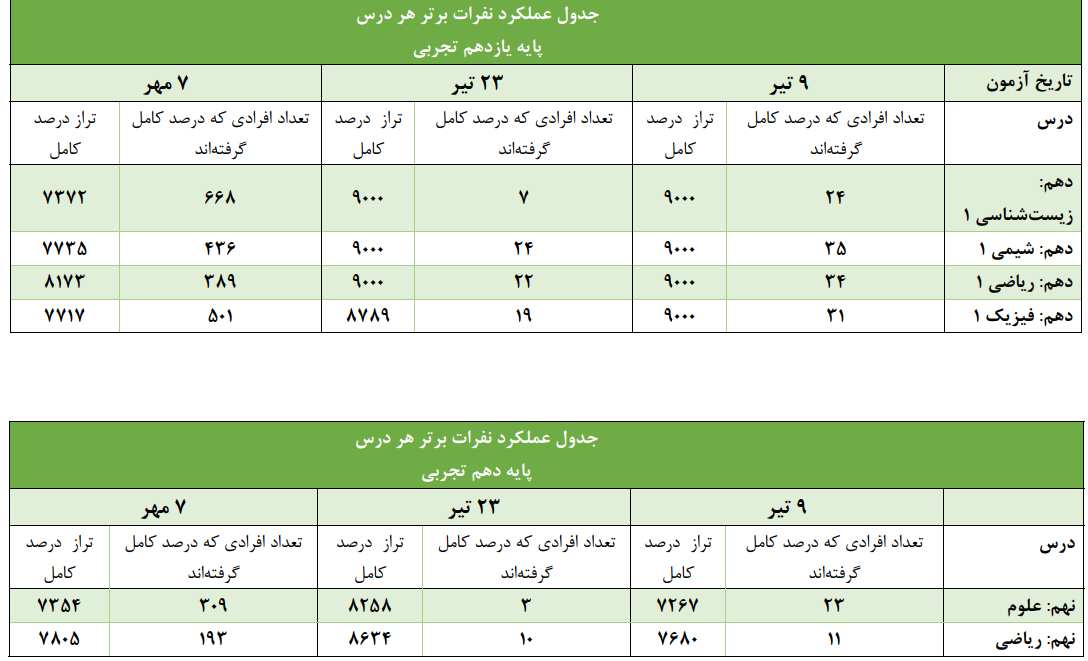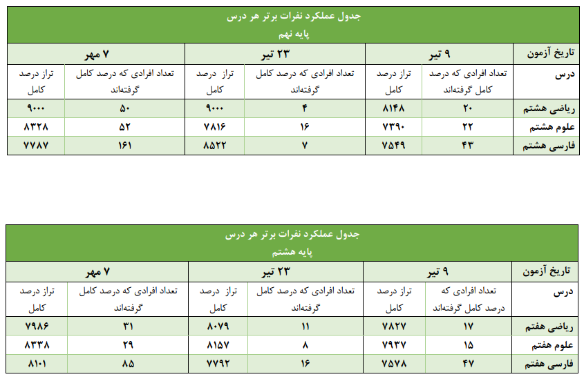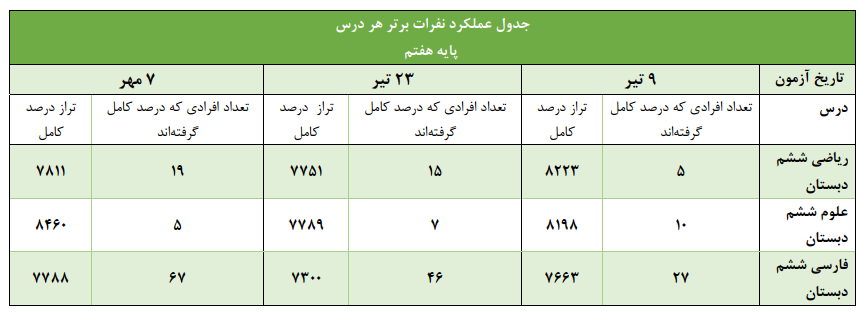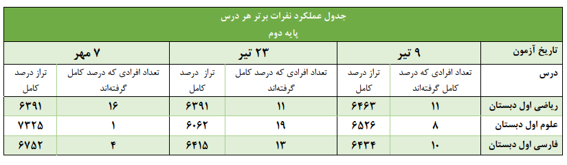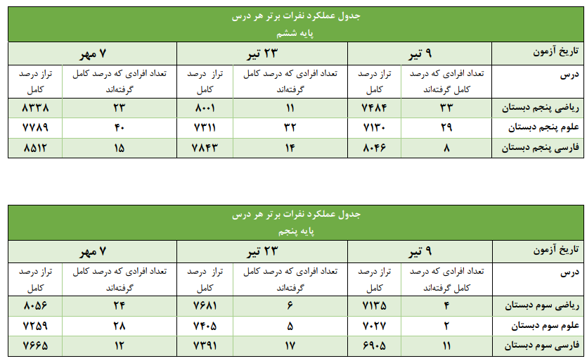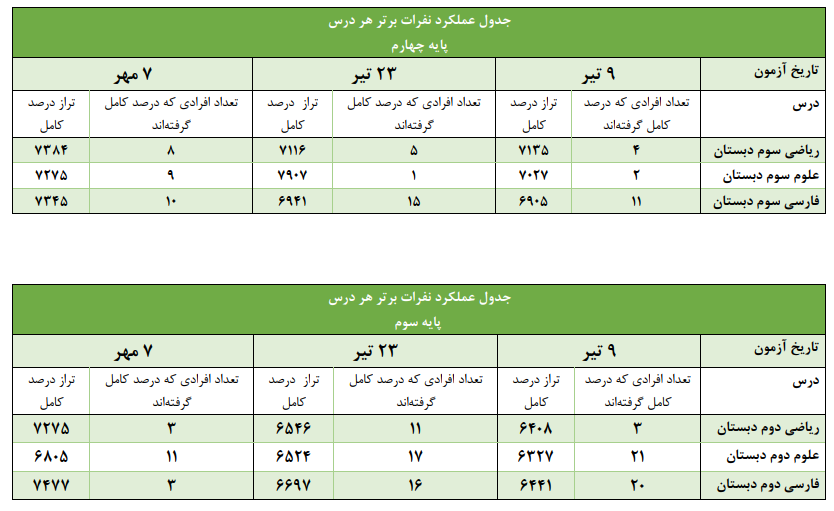 در گزارش ذیل تعداد دانش آموزان تعداد دانش آموزانی که در هر پایه و هر درس توانسته اند به تمامی سوالات پاسخ صحیح بدهند و تراز این دانش آموزان قابل مشاهده است.