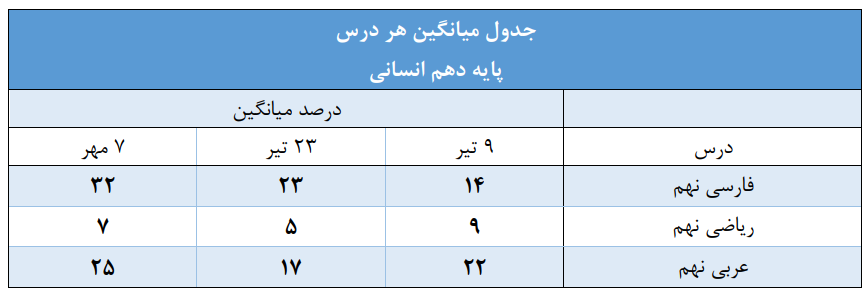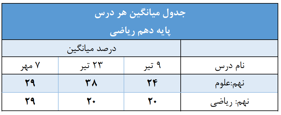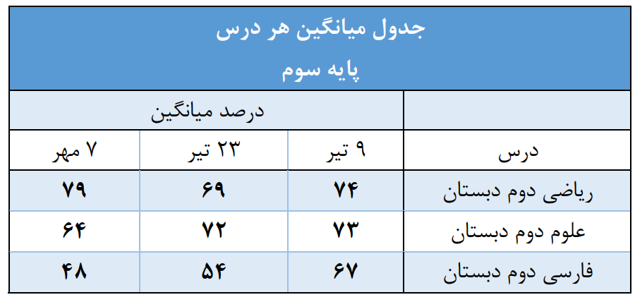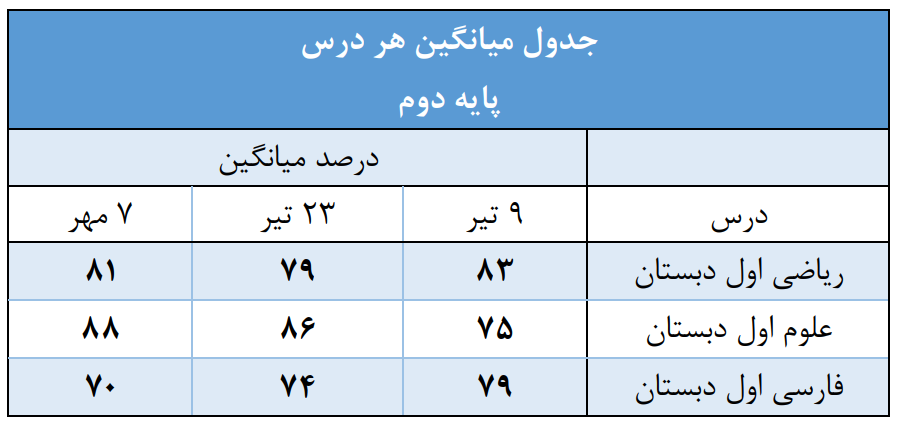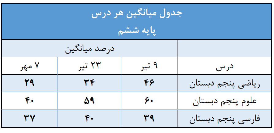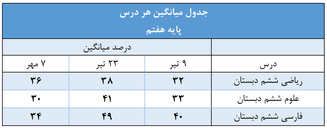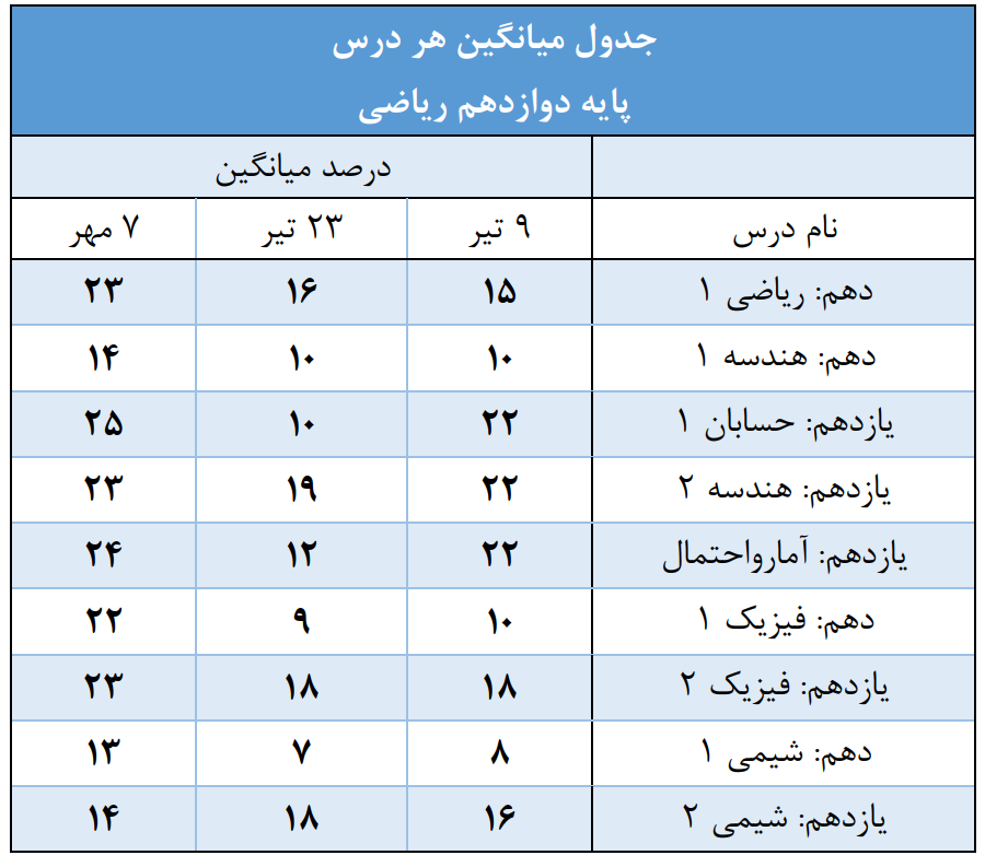 در گزارش بعدی وضعیت میانگین پاسخگویی درس ها قابل مشاهده است که در 2 آزمون ابتدایی (شروع تابستان) به چه صورت بوده است و در انتهای پروژه تابستان یعنی آزمون 7 مهر به چه وضعیتی رسیده است.