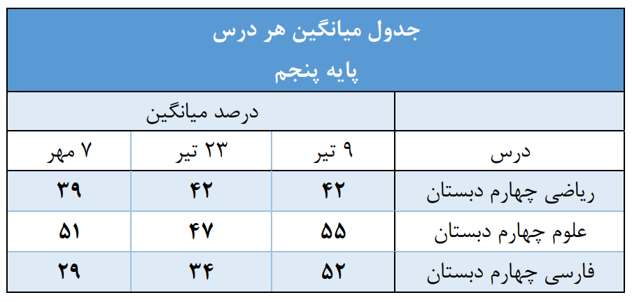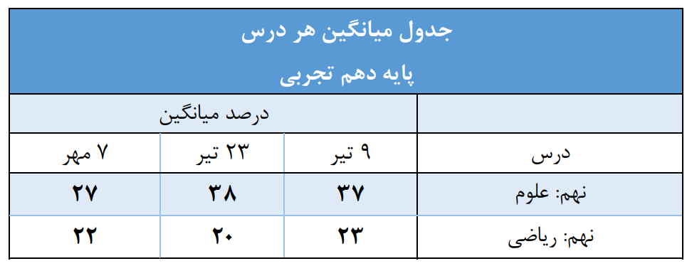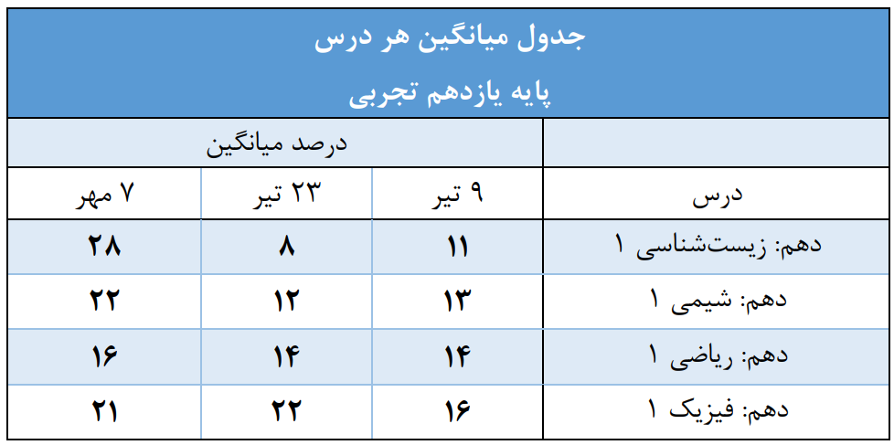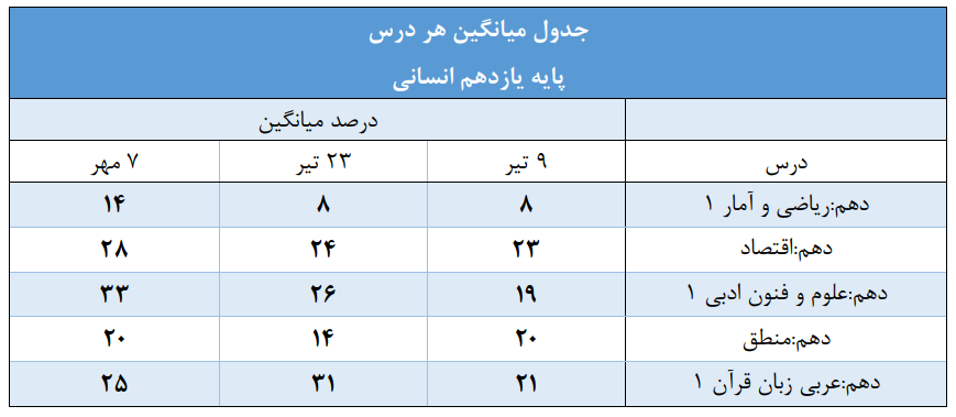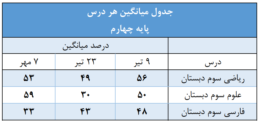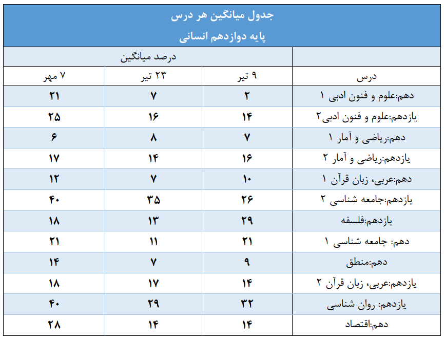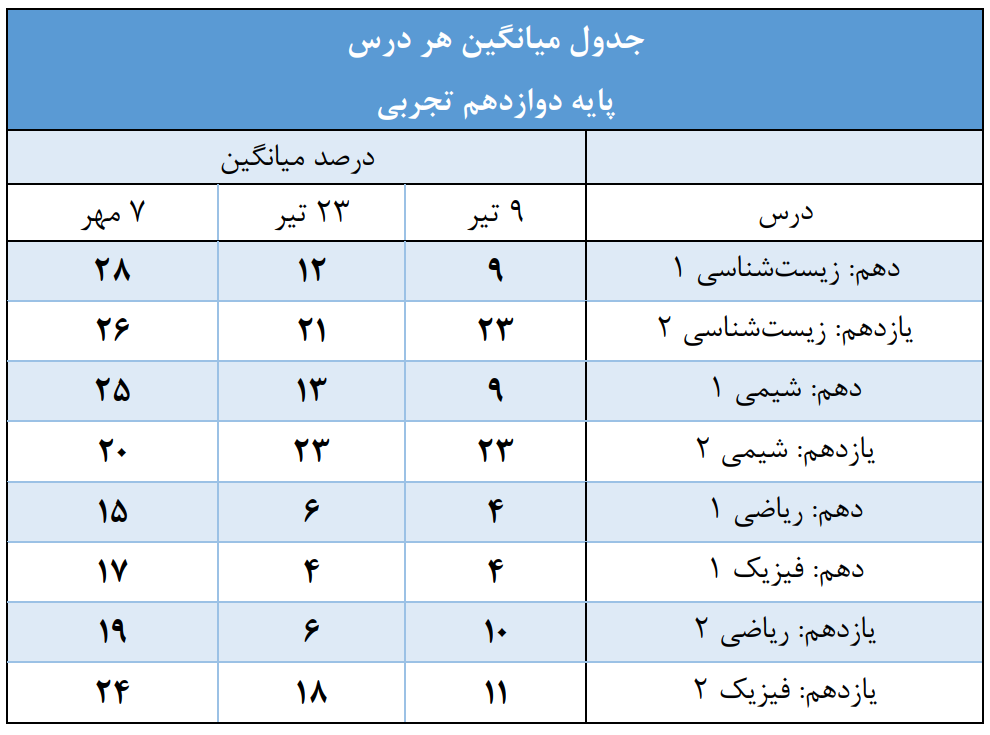 در گزارش بعدی وضعیت میانگین پاسخگویی درس ها قابل مشاهده است که در 2 آزمون ابتدایی (شروع تابستان) به چه صورت بوده است و در انتهای پروژه تابستان یعنی آزمون 7 مهر به چه وضعیتی رسیده است.