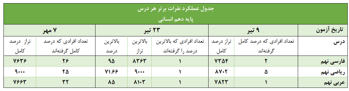 در جدول زیر شما میتوانید 3 آزمون سکو مقایسه ای و جامع 9 تیر و 23 تیر و 7 مهر را بصورت مقایسه ای در 2 موضوع 100% ها و میانگین درصد پاسخگویی مشاهده کنید.