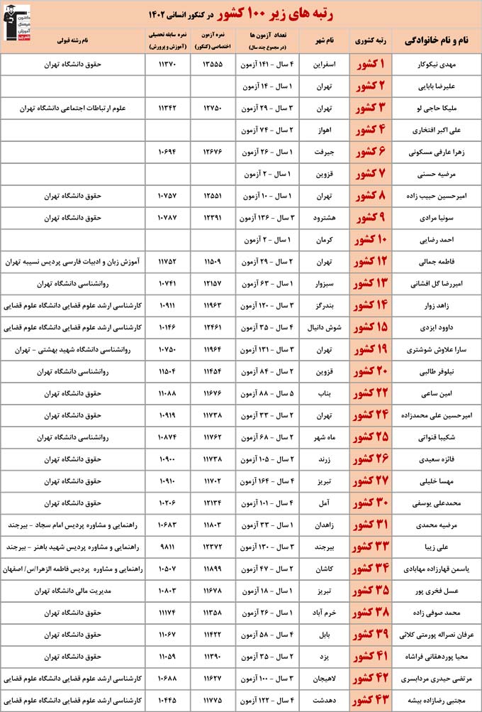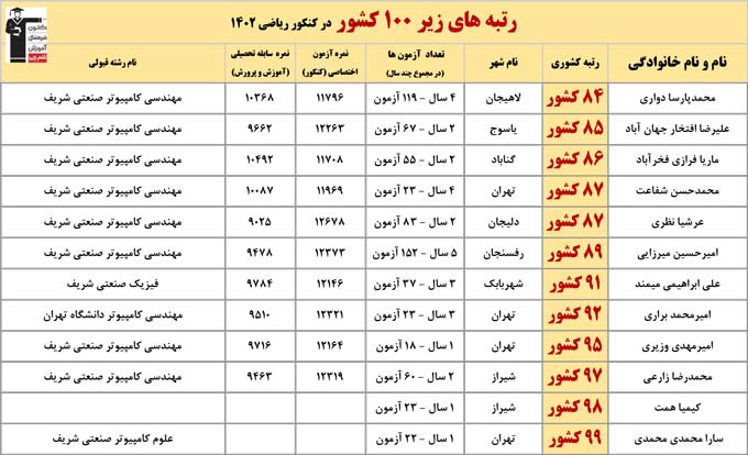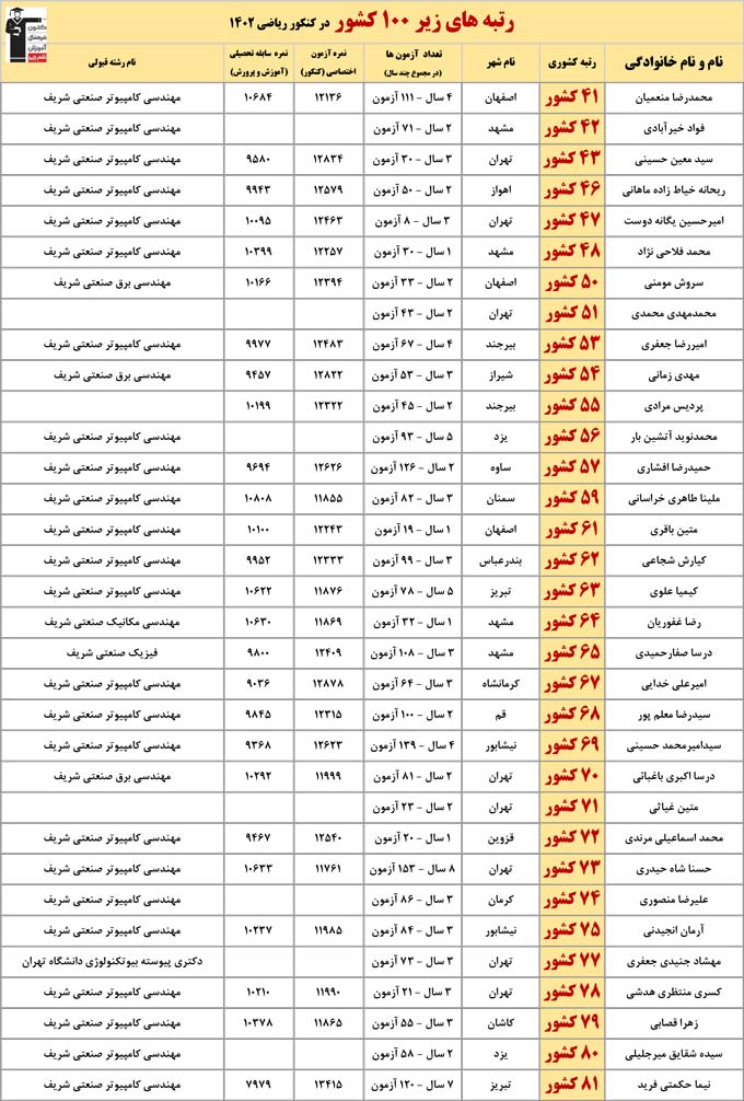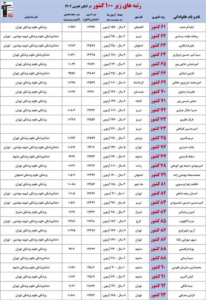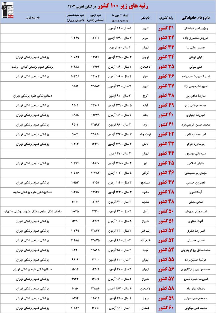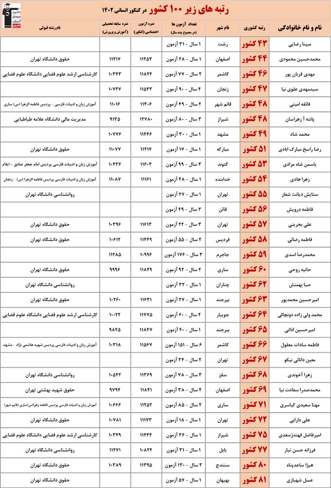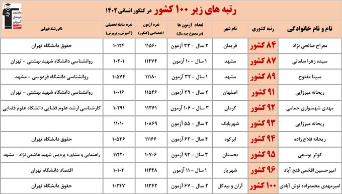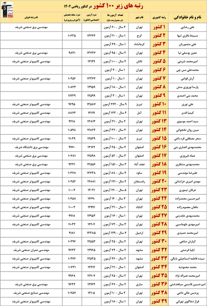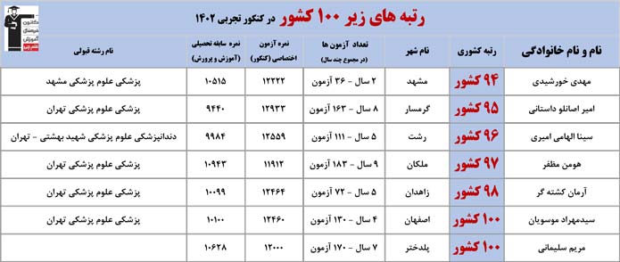 رتبه های زیر 100 کشور در رشته ریاضی و تجربی و انسانی چند نفر کانونی بودند ؟ هر کدام در چند آزمون شرکت داشته اند.