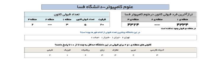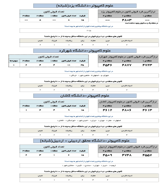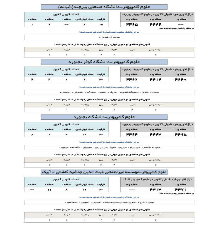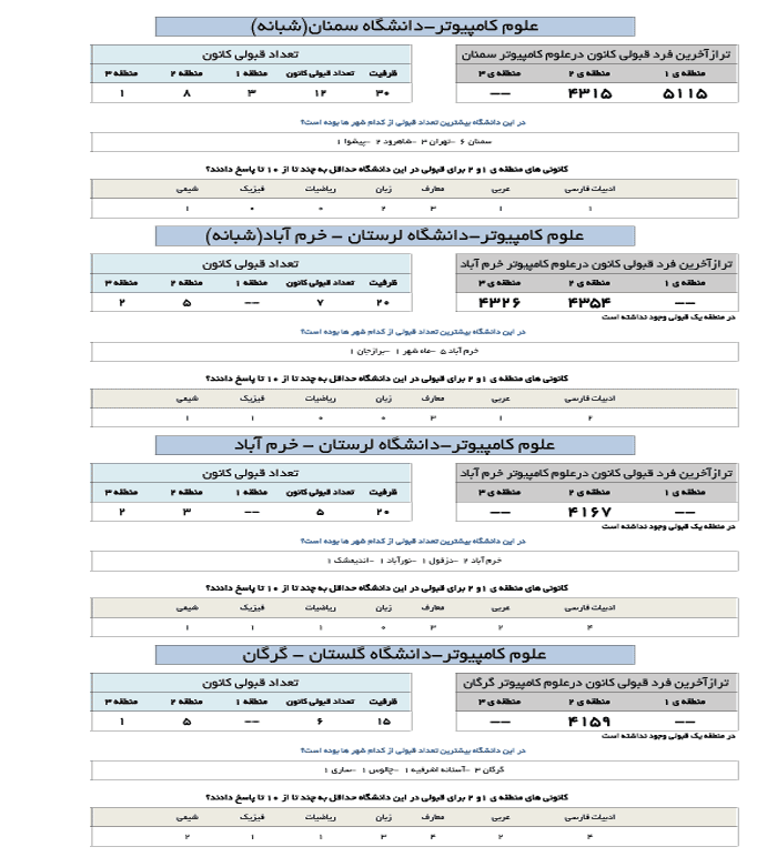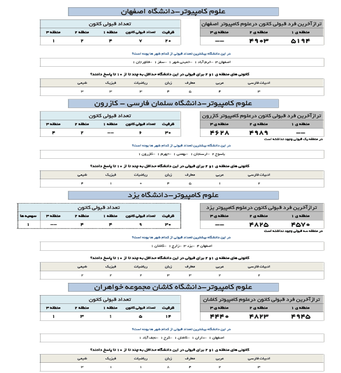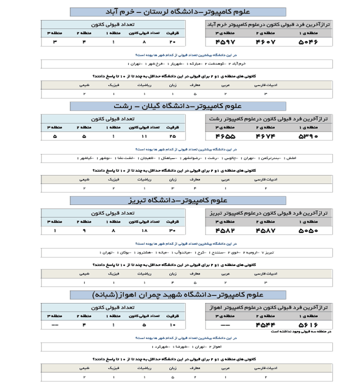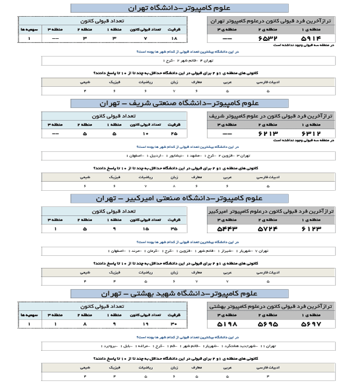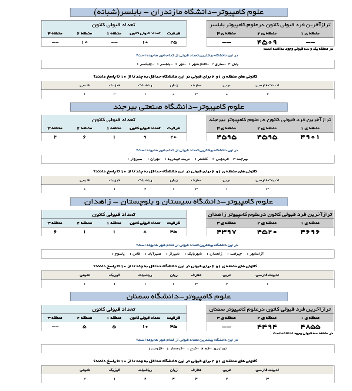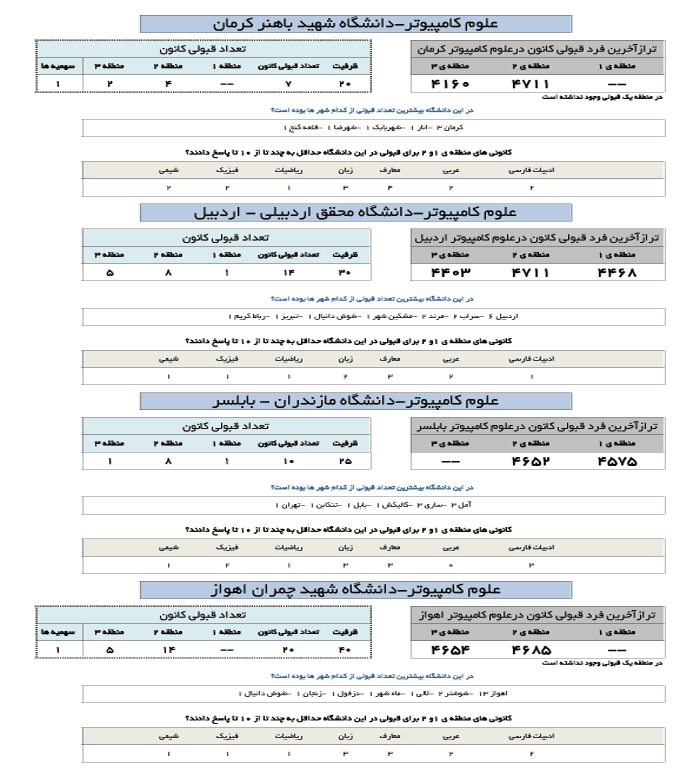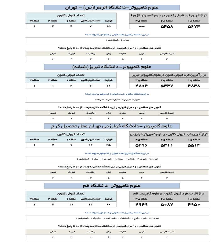 در جدول زیر تراز آخرین فرد قبول شده کانونی در رشته علوم کامپیوتر در دانشگاه های مختلف ارائه شده است.