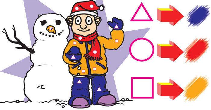 با رنگ قرمز در بعضی از قسمتهای این تصویر، تعدادی مثلث، مربع و دایره کشیده شده است. شما باید هر قسمتی را که مثلث دارد، آبی کنید، هر قسمتی را که دایره دارد، قرمز کنید و هر قسمتی را که مربع دارد، نارنجی کنید. بقیه قسمتهای این تصویر را هم سفید بگذارید. چون فصل زمستان است و آن قسمتهای سفید، از برف پوشیده شده است.